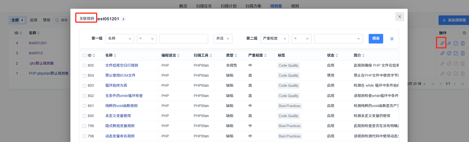 **规则集操作栏关联**:在规则集列表中,找到需要关联规则的新建规则集,点击其操作栏中的 “关联规则” 按钮。系统会弹出规则选择界面,仅展示该规则集所选编程语言对应的规则,从中勾选需要关联的规则,点击确认即可完成关联。