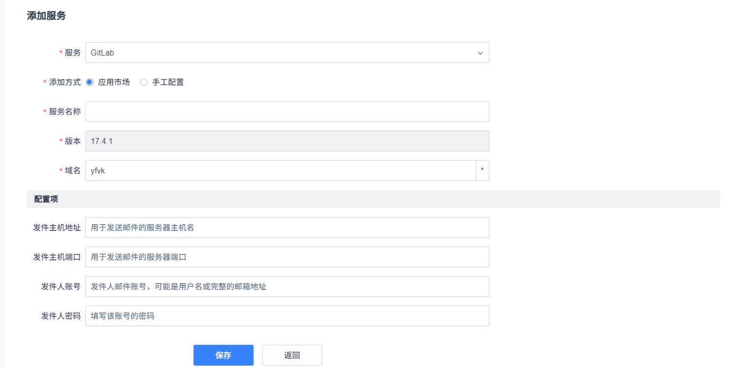 平台提供了两种添加服务的方式,在服务列表点击添加服务。如果你的组织尚未开始构建 DevOps 工具链,强烈推荐你直接通过组件安装工具。这样做可以大大降低部署和维护 DevOps 工具的成本,这里以安装GitLab为例: