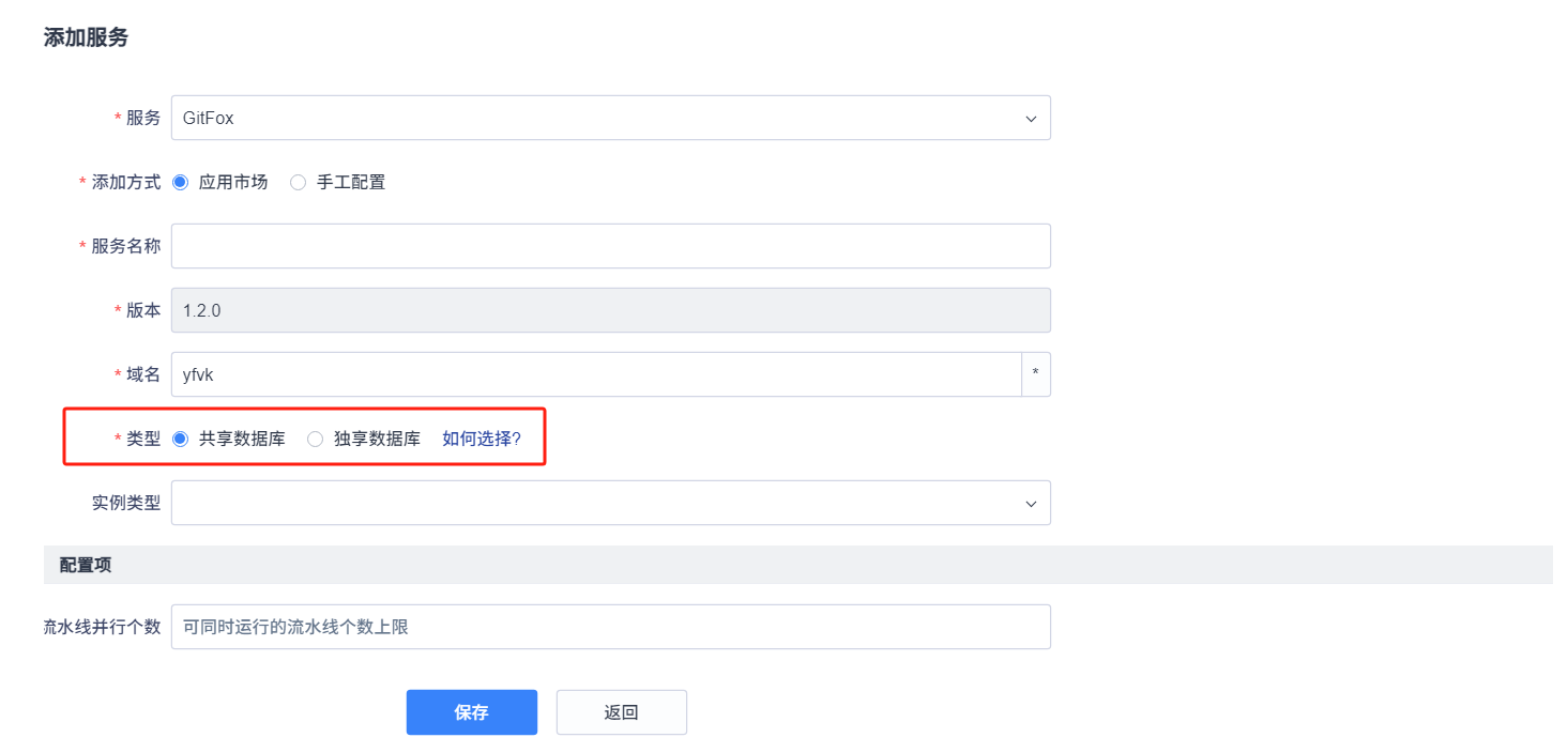 - 共享数据库:默认设置,会显示平台上可以使用的共享数据库名称,数据库类型会根据用户选择的服务动态变化,如服务需要MySQL数据库,会显示目前平台上已经安装的全局共享MySQL数据库实例的名称。如果你的机器配置不高,建议使用共享数据库。