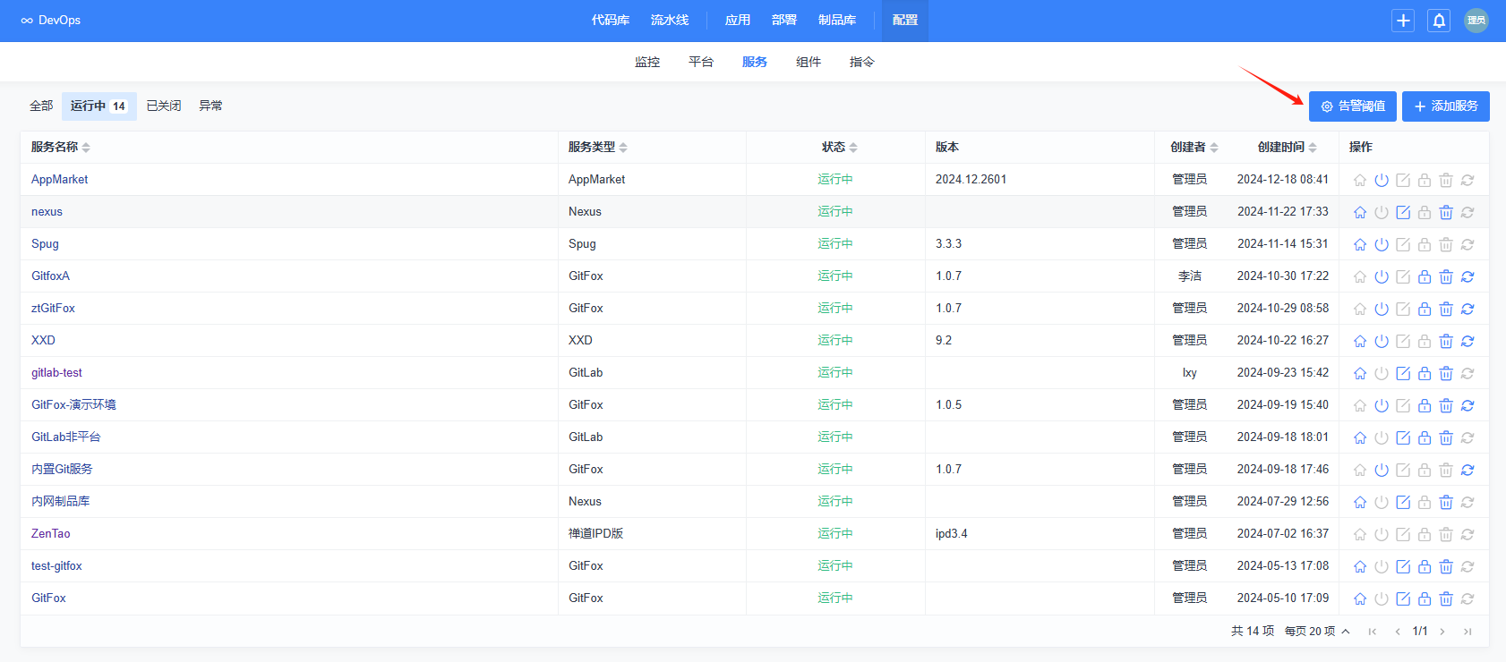 平台提供服务阈值设置功能,用户可以在配置下的服务页面点击右上角的【告警阈值】来配置服务告警阈值