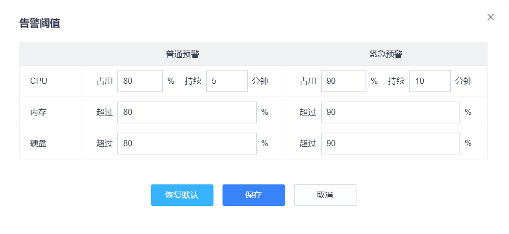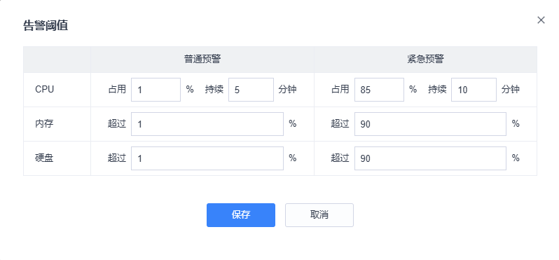 可以根据需求设置CPU、内存、硬盘的普通告警阈值和紧急预警阈值。