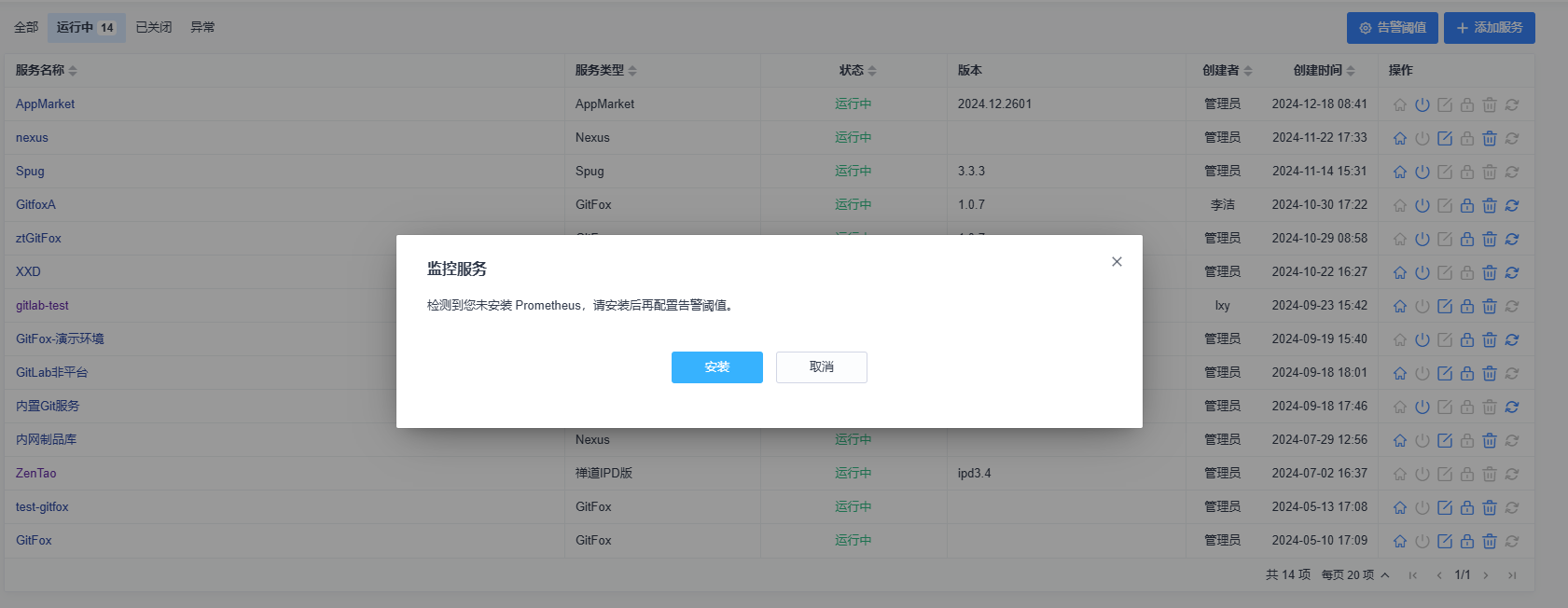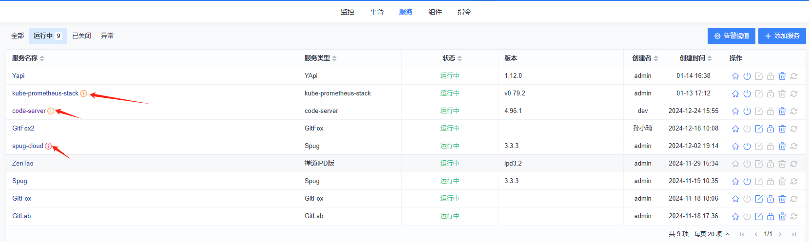 服务是指为建设DevOps体系而需要管理的一系列相关的工具,包括源代码管理、静态代码分析、流水线自动化、制品库管理、运维自动化等。为了降低安装和维护这些工具所带来的成本,平台提供了一键安装服务、集中监控服务状态等功能,以简化DevOps工具链的建设过程。