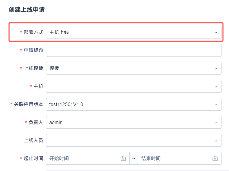 部署方式为主机上线和渠成上线时,产品和发布为必填项,并且发布下需要有制品,这样才可以上线成功,。