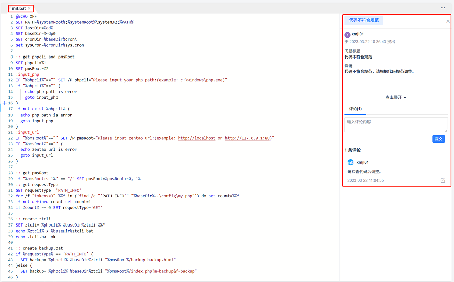 添加后在代码行后会显示问题图标,点击即可浏览问题详情信息以及提交评论。