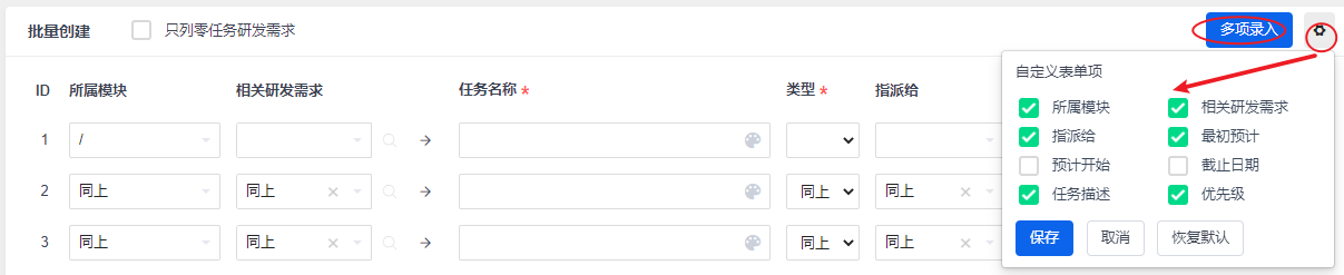 批量创建任务时,可以选择“多项录入”,即将多行文本粘贴到文本框中,禅道会自动将每行文字添加为一个任务的标题。