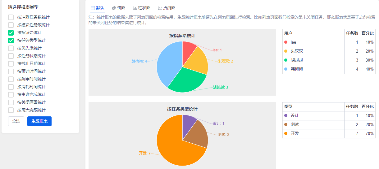 禅道中,可以以饼图、柱状图、以及折线图统计任务。勾选报表页面的左侧“报表类型”,点击“生成报表”即可在右侧查看相应的报表。