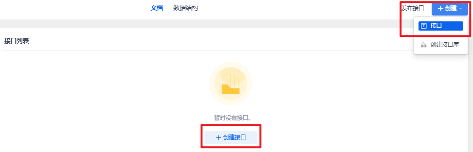 点击页面中间的创建接口按钮,或者是右上角的创建按钮,都可以进入创建接口文档的页面。