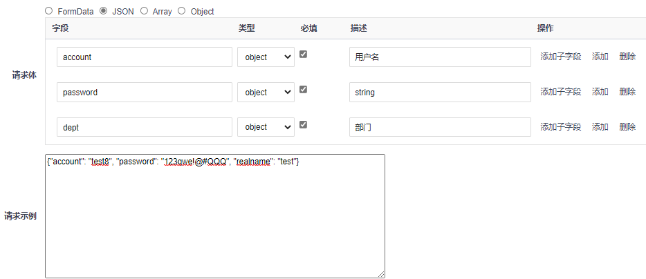 请求响应:填写该接口的响应字段、字段类型、是否必填、描述、添加子字段等操作。