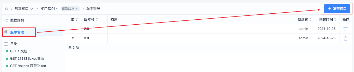 发布接口后,还可以在目录右上角的更多按钮,进行版本管理。在这里可以查看已发布的版本和删除不需要的版本。