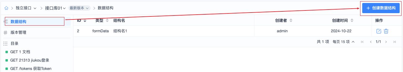 在接口空间中库的列表页,点击左侧树形导航中的数据结构,点击右上角的创建数据结构按钮可以创建数据结构。