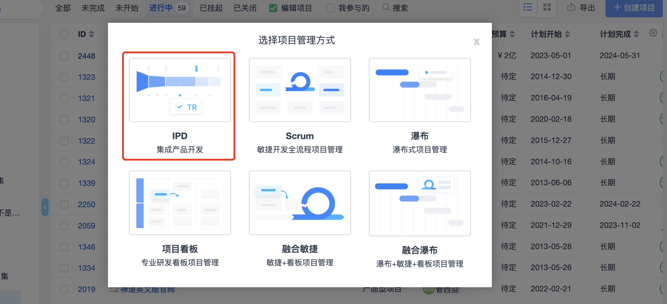 IPD研发管理流程是在禅道已有的项目管理流程基础上增加了IPD管理模型,创建项目时可以选择 IPD集成产品开发模型。