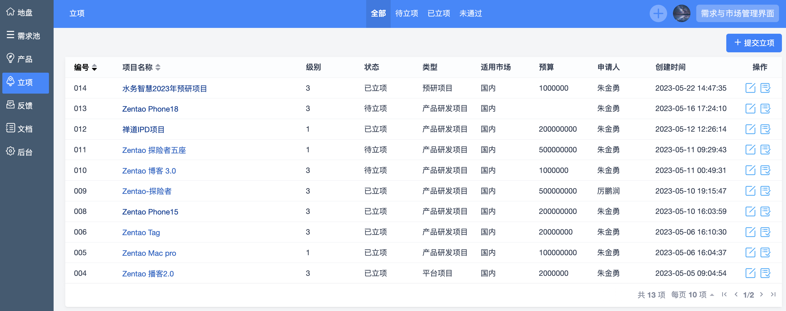 点击一级导航的立项,默认进入全部的立项列表,可以切换到待立项、已立项、未通过筛选标签查看相应状态的立项信息。