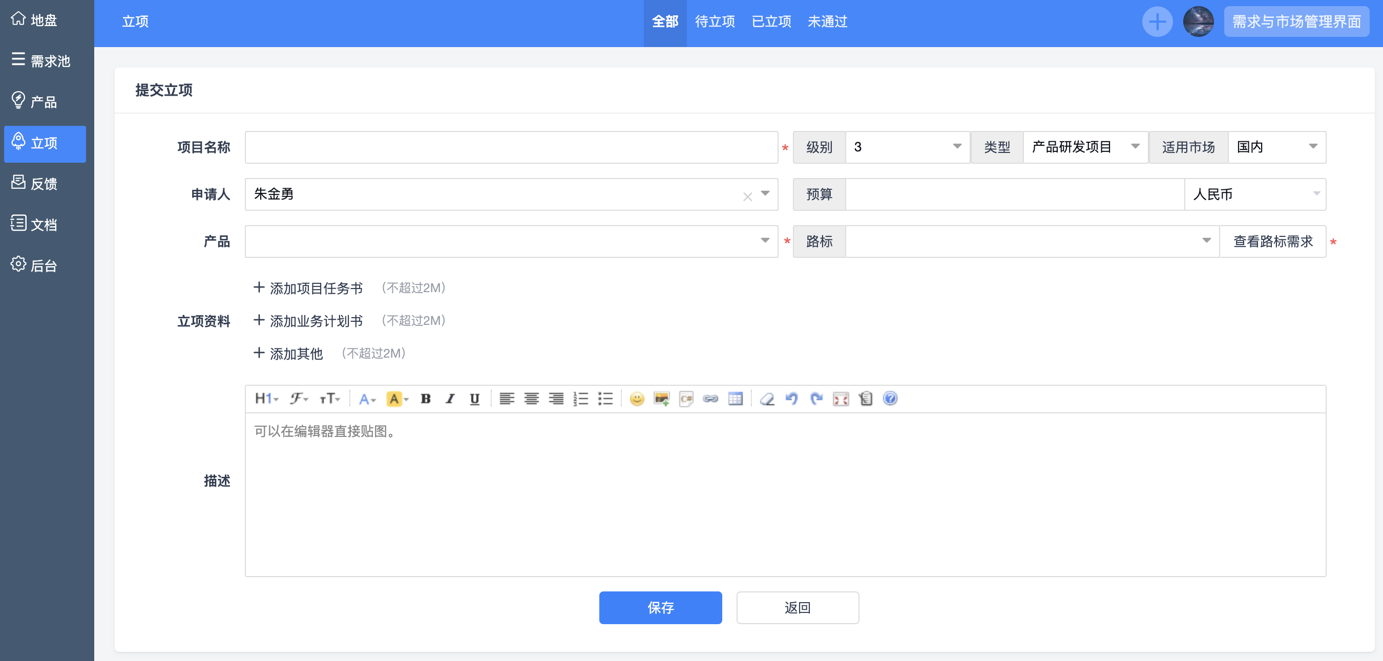 填写项目名称、级别、类型、适用市场、申请人、预算、产品、路标、上传立项资料、描述,点击保存即可。
