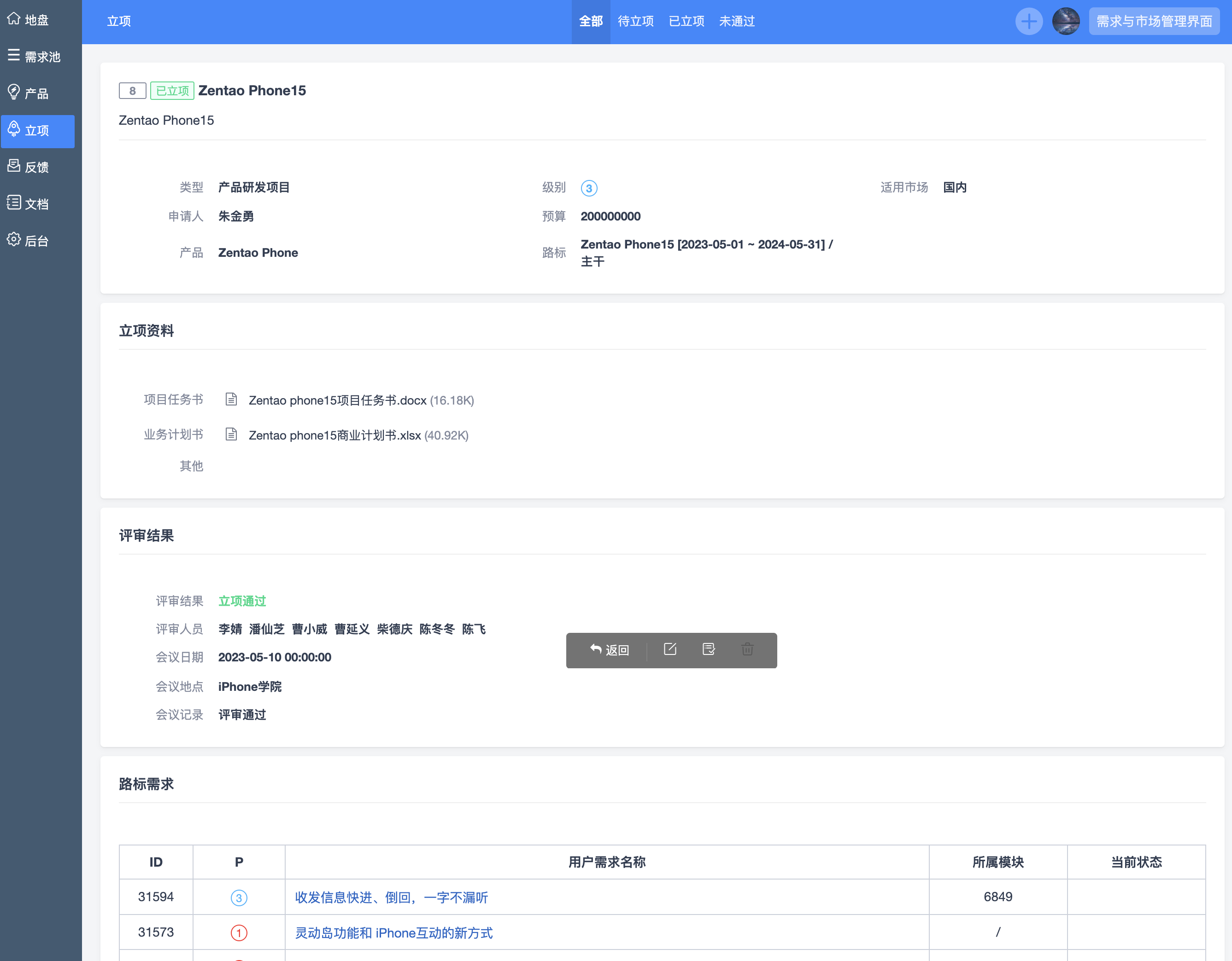 立项详情页面主要由立项基本信息区块、立项资料区块、评审结果区块和路标需求区块组成。