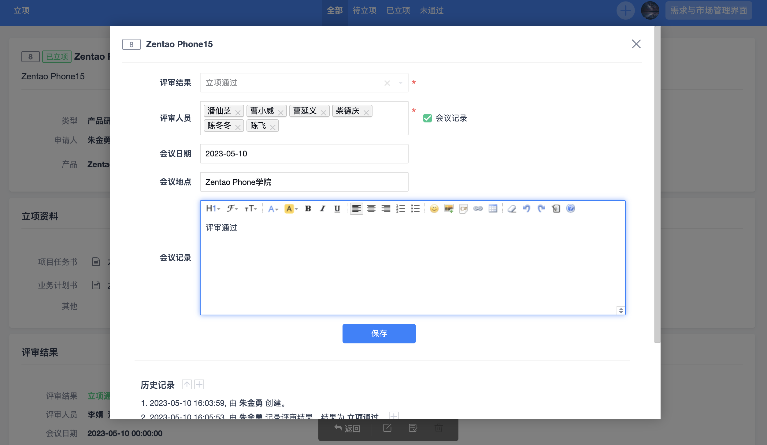 在弹窗中可以记录评审结果(未通过、立项通过)、评审人员、会议日期、会议地点、会议记录。