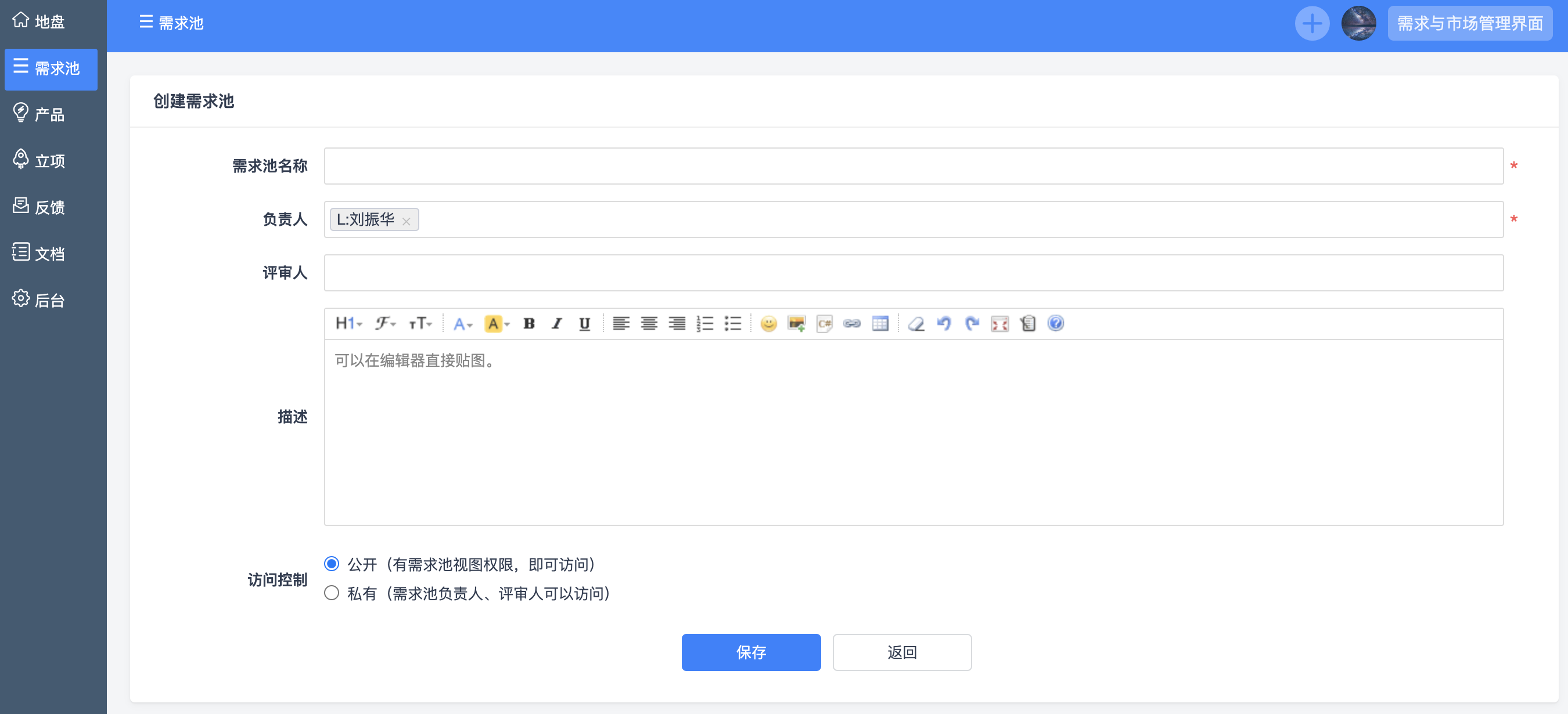 填写需求池名称、负责人(创建人会默认添加到负责人中)、评审人、描述、访问控制等信息,点击保存即可。