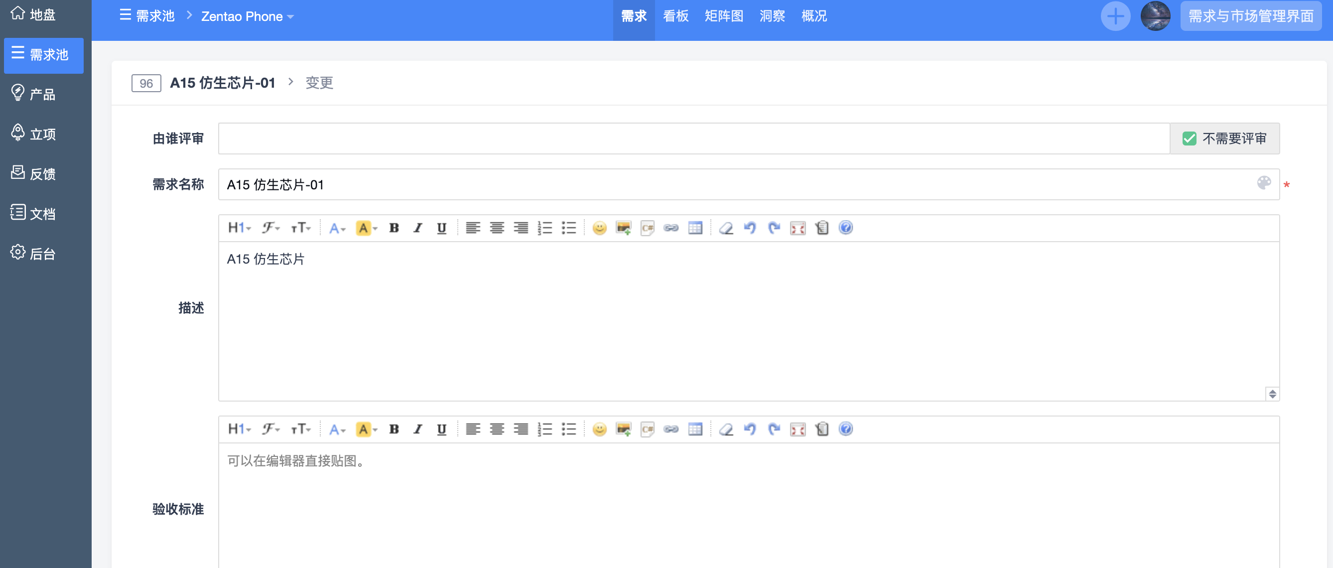 需求变更页面中可以设置变更后的评审人,修改需求的名称、描述、验收标准等信息。