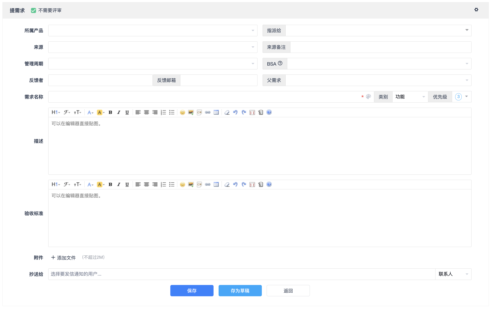 填写需求名称、所属产品、指派给、来源、管理周期、优先级、描述等基本信息,可存为草稿或直接保存。