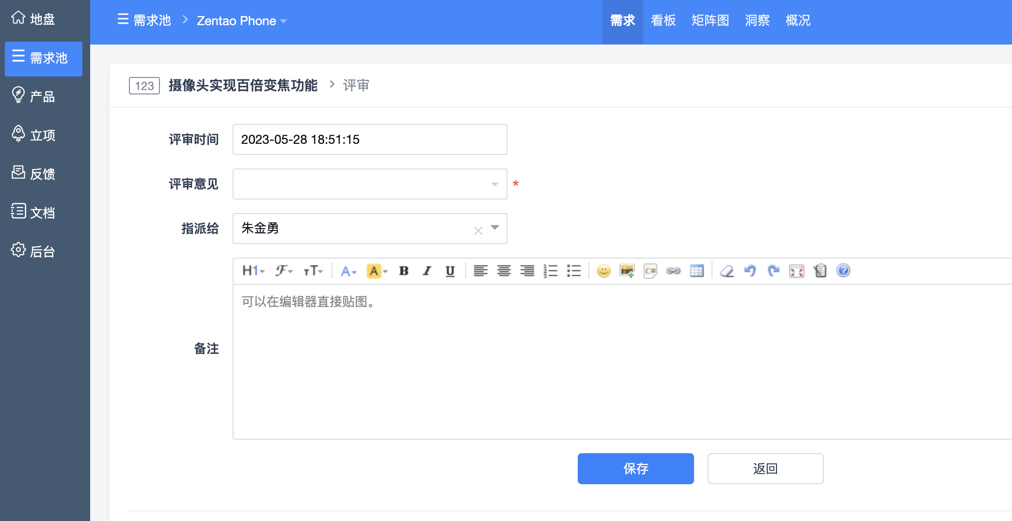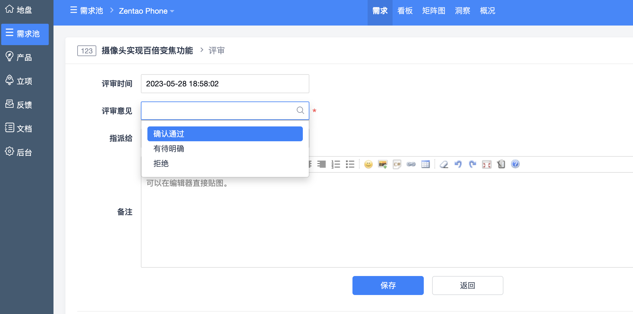 评审详情页面中,可以从需求的合理性、完整性、可实现性等维度进行评审。