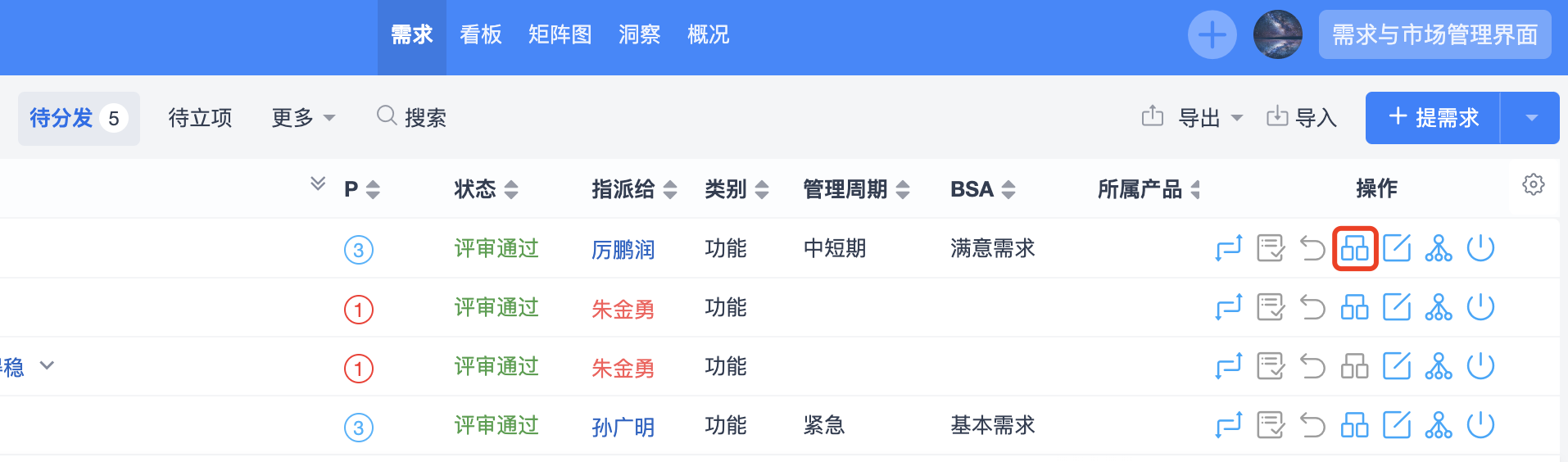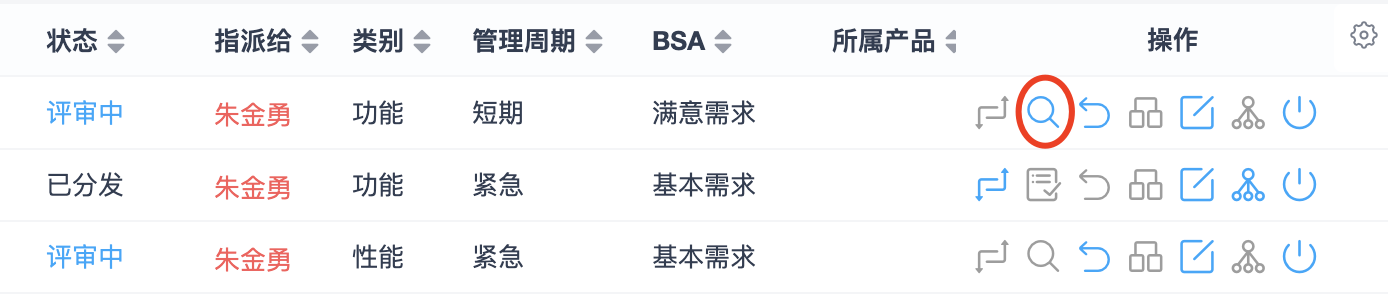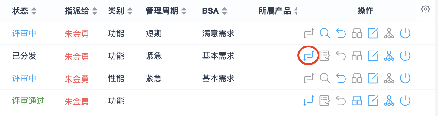 可以通过需求列表右侧的操作按钮,对需求进行变更、提交评审、评审、撤销评审、分发、编辑、细分、关闭等操作。