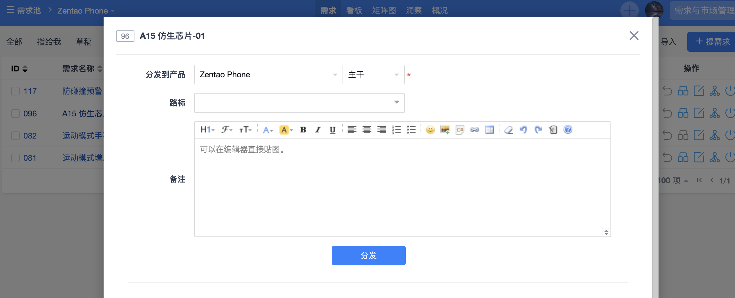 需求分发页面可以将需求分发到对应的产品、路标中。