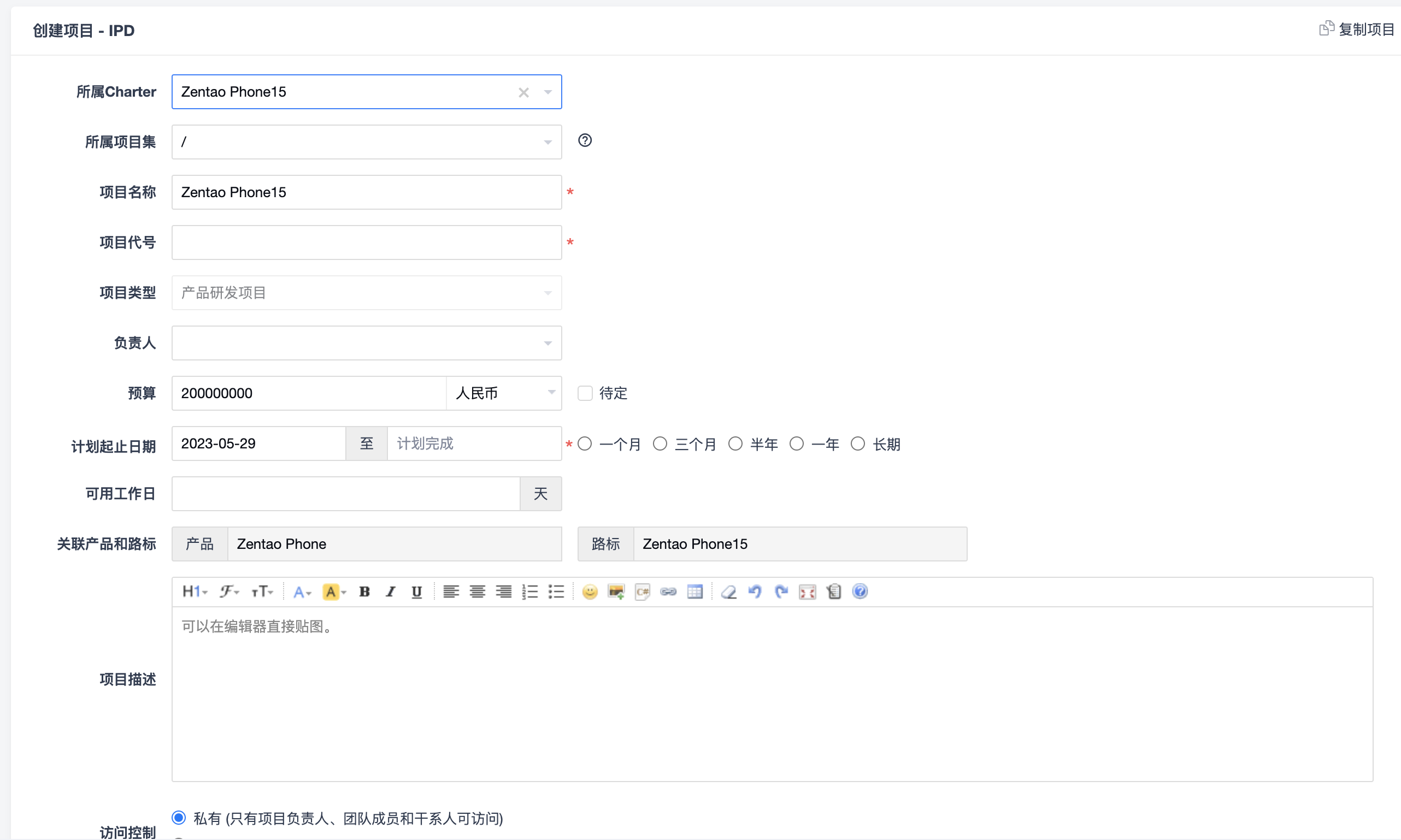 选择立项通过的Charter后会将Charter中的相关信息自动带入进来,包括:项目名称、项目类型、预算、产品和路标。