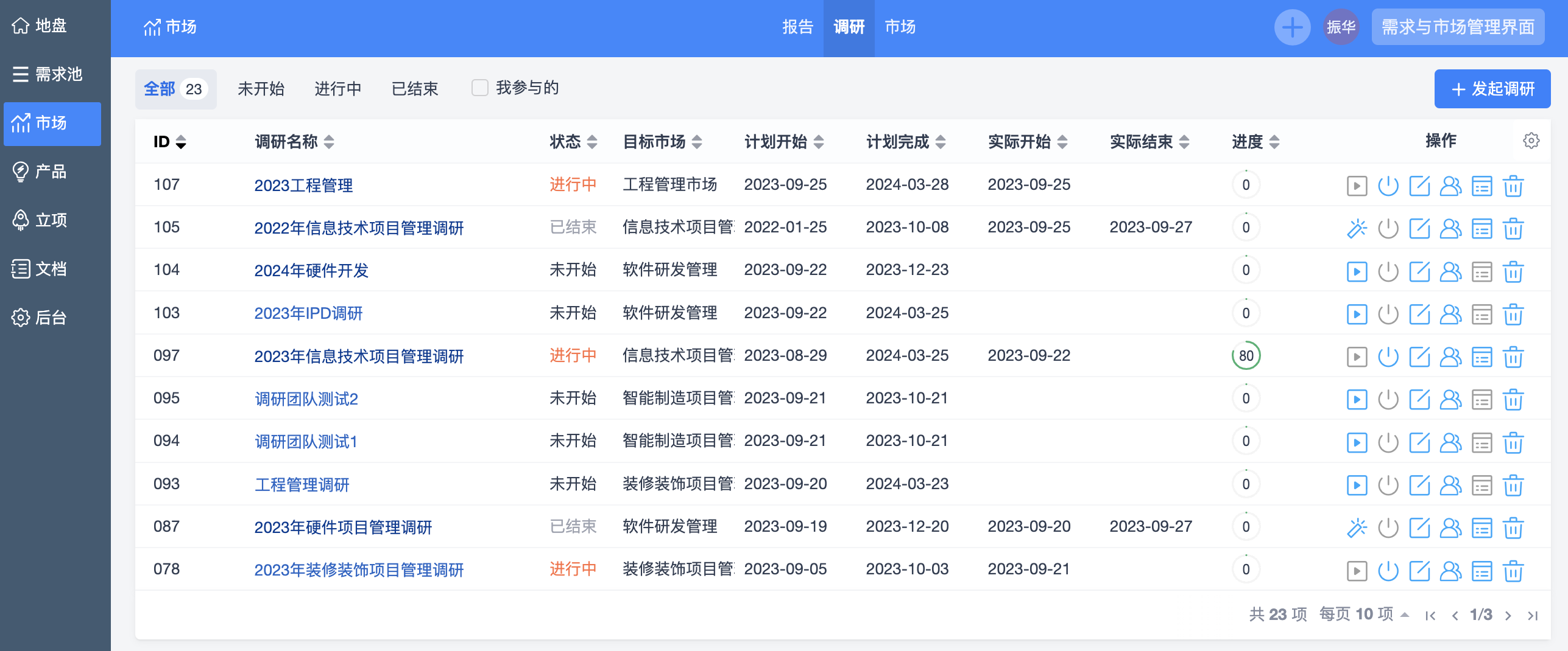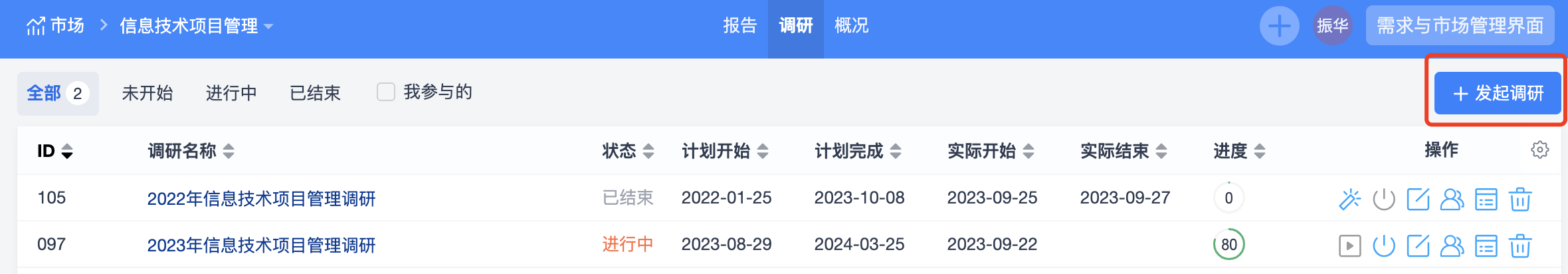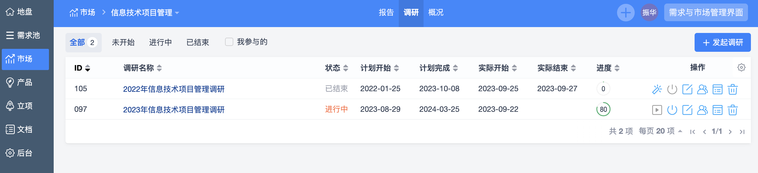 市场管理中包括2个调研列表,一个是总的调研列表,可以汇总查看公司所有的调研信息;另一个是具体一个市场的调研列表,只能查看当前市场的调研信息。