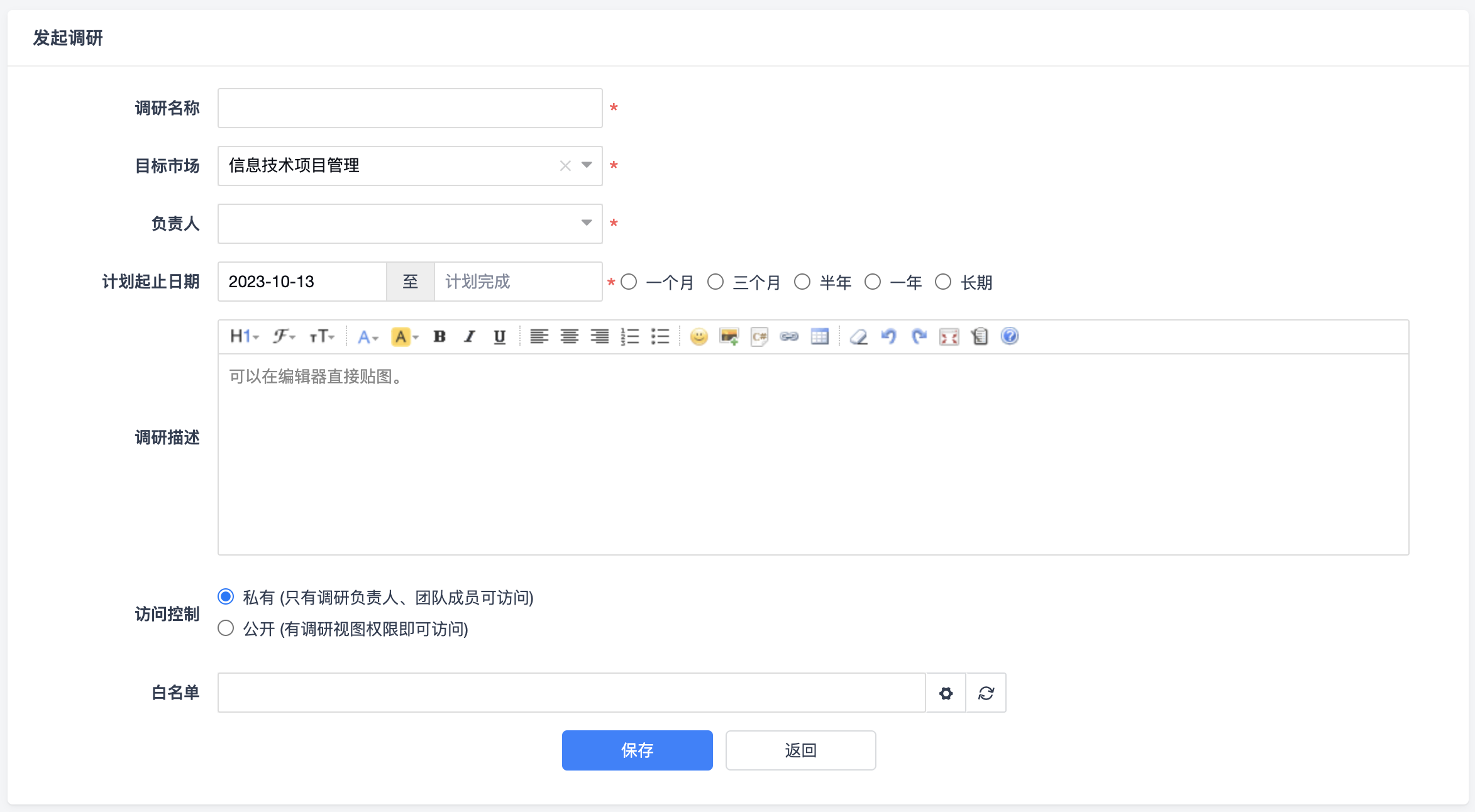 发起调研页面中可以维护调研的基本信息,包括调研名称、目标市场、负责人、计划起止日期、调研描述、访问控制等信息。