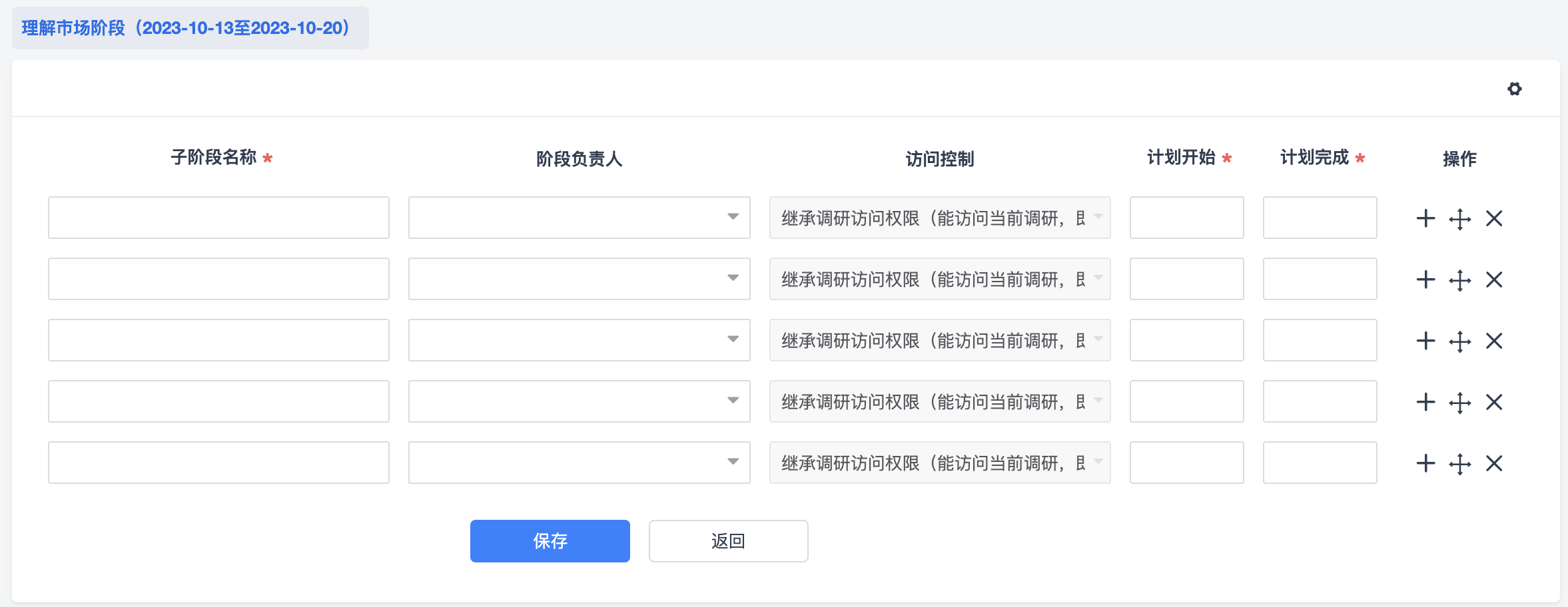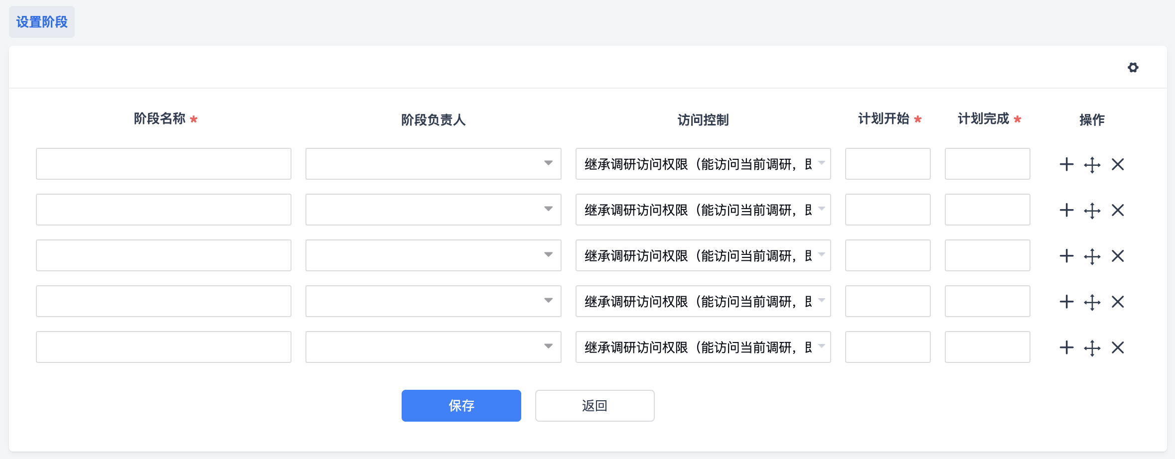 设置阶段页面可以维护阶段名称、负责人、访问控制、计划开始、计划完成日期等信息。