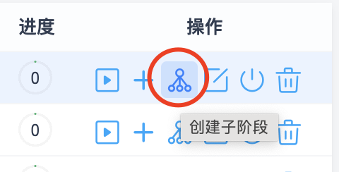 如果某一阶段需要划分子阶段,可以在阶段列表中对应阶段的操作中点击创建子阶段按钮,即可拆分子阶段。