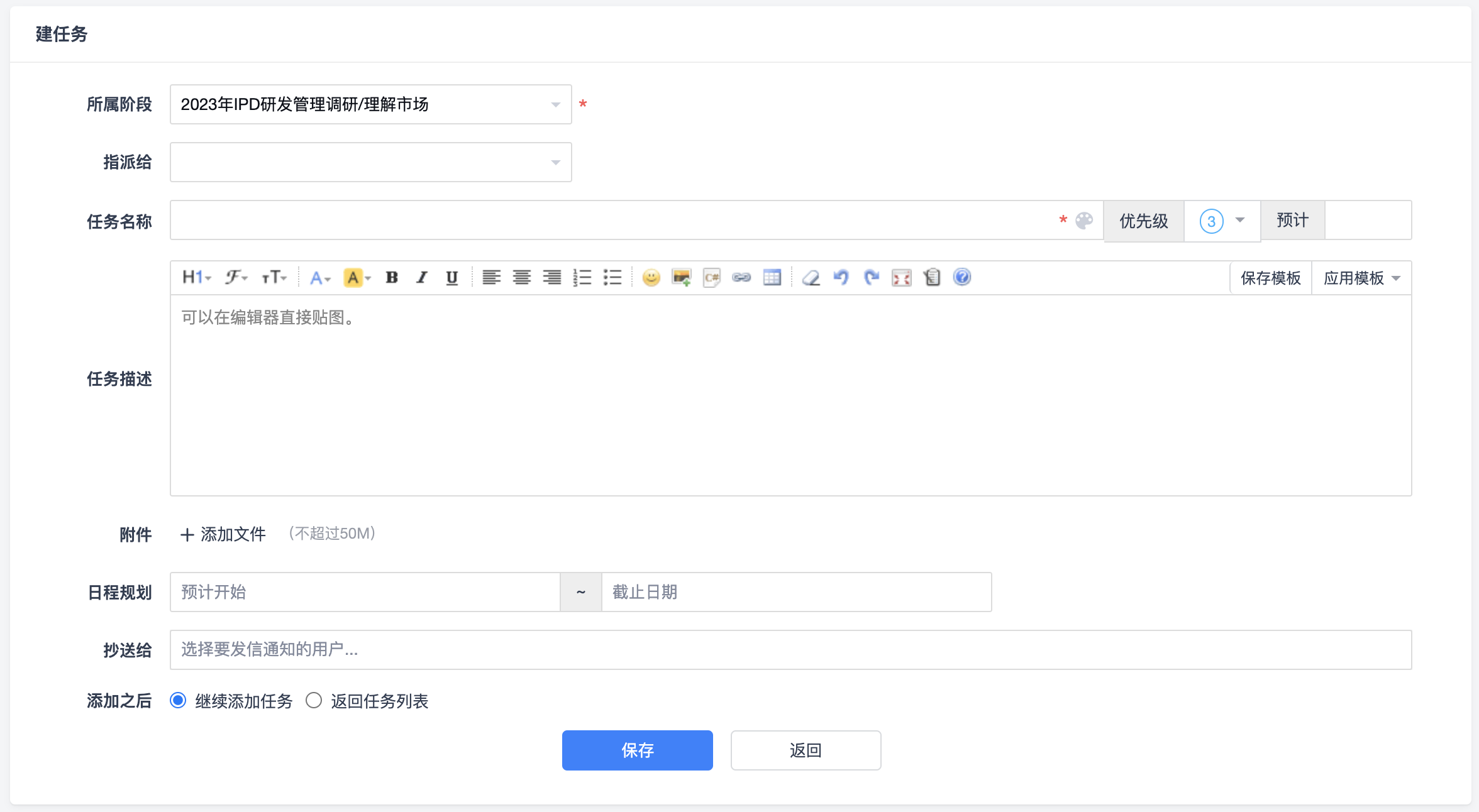 建任务页面中可以设置任务的所属阶段、指派人、任务名称、优先级、预计工时、任务描述、附件、日程规划、抄送给等信息。