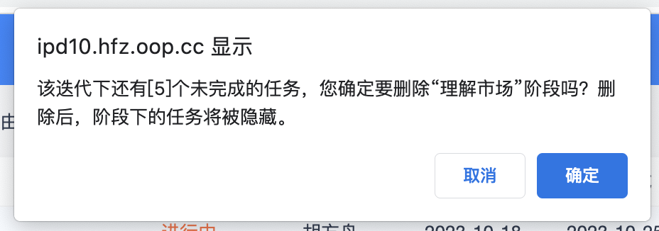 点击删除阶段,则可以删除不需要的阶段。删除时会提醒该阶段下是否存在数据,如果执行删除,其他数据将被隐藏。