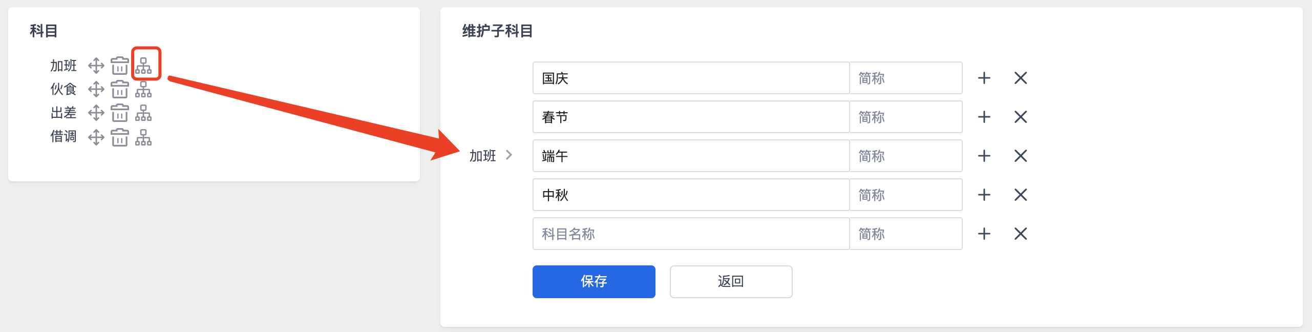 2. 科目支出多级拆分,选择具体科目后的维护科目按钮,可维护当前科目的子科目。