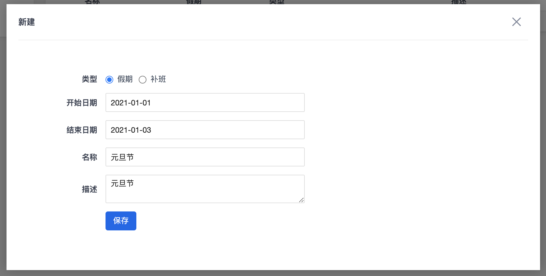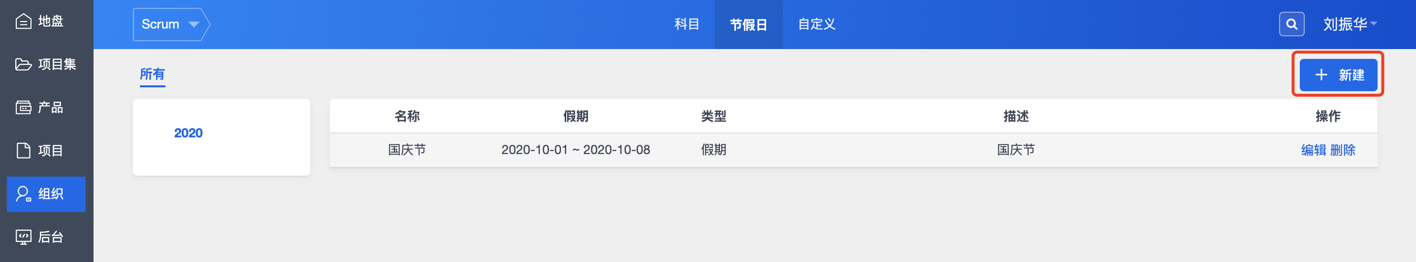 1. 进入组织--节假日视图,然后选择“新建”,即可进入新建节假日页面。