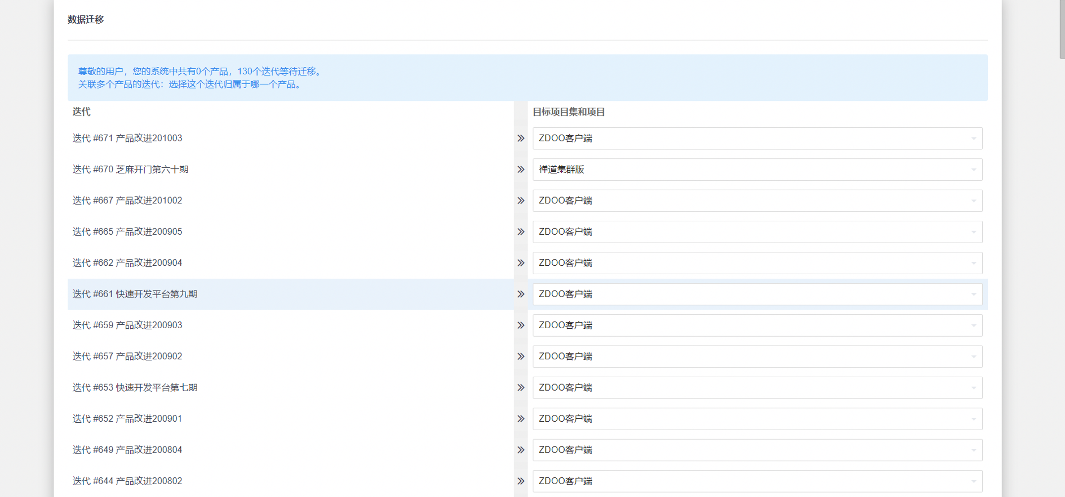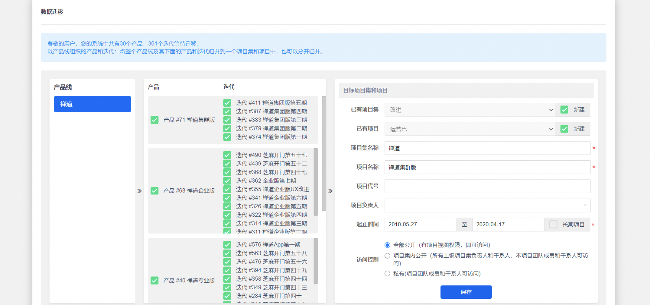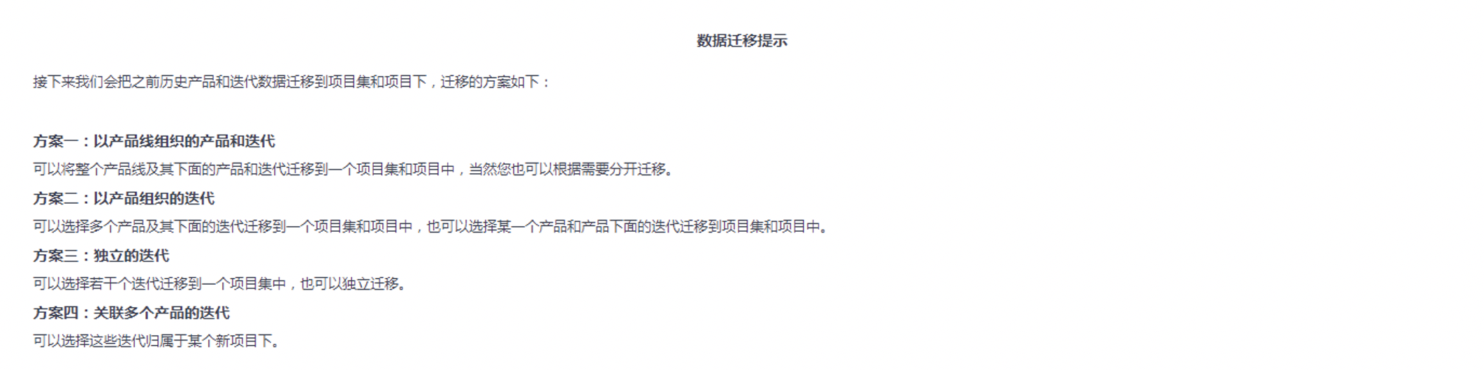 在产品线列表中选择具体的产品线,可以将整个产品线及其下面的产品和迭代迁移到一个项目集和项目中,也可以根据需要分开归并。