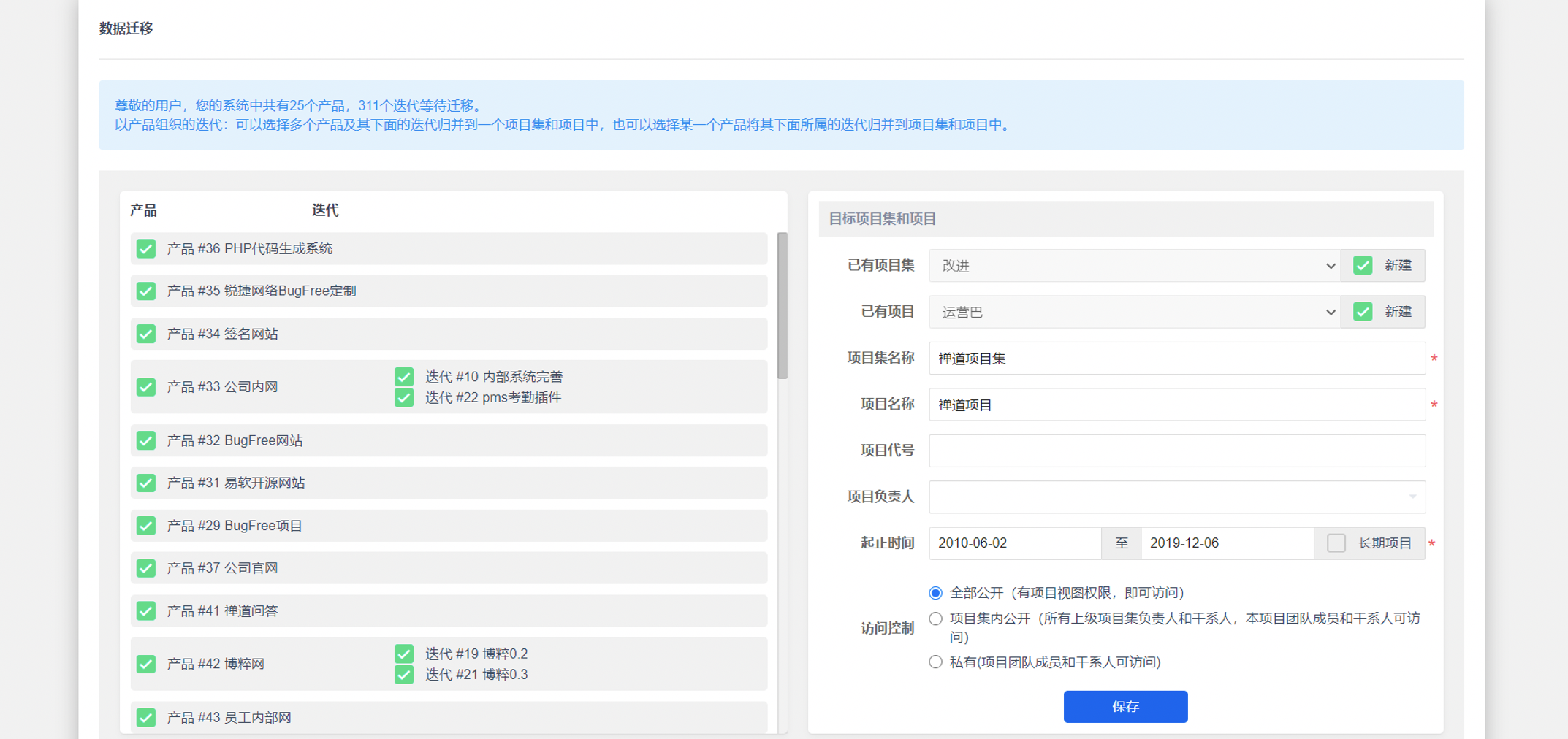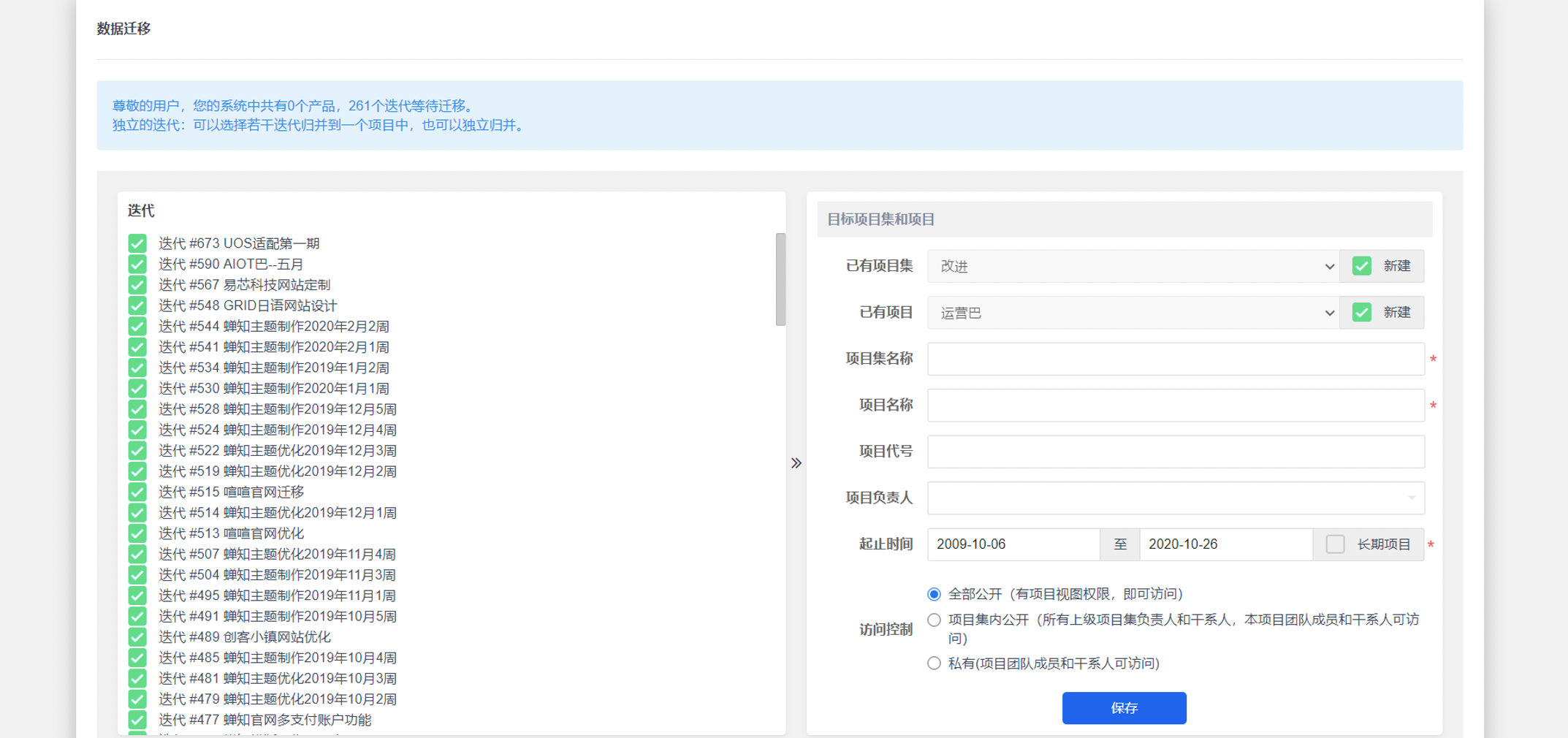 在目标项目集和项目模块中,可以新建项目集和项目,也可以在已有数据中进行选择,并且可以设置目标项目的基本信息和访问控制信息。