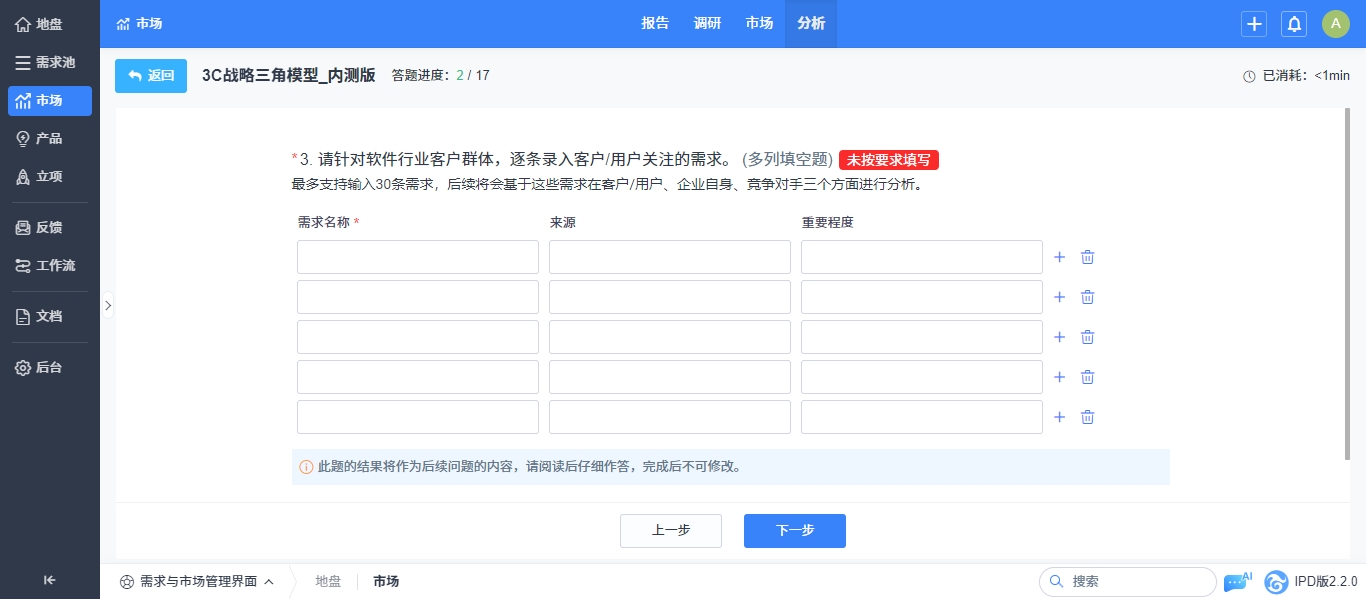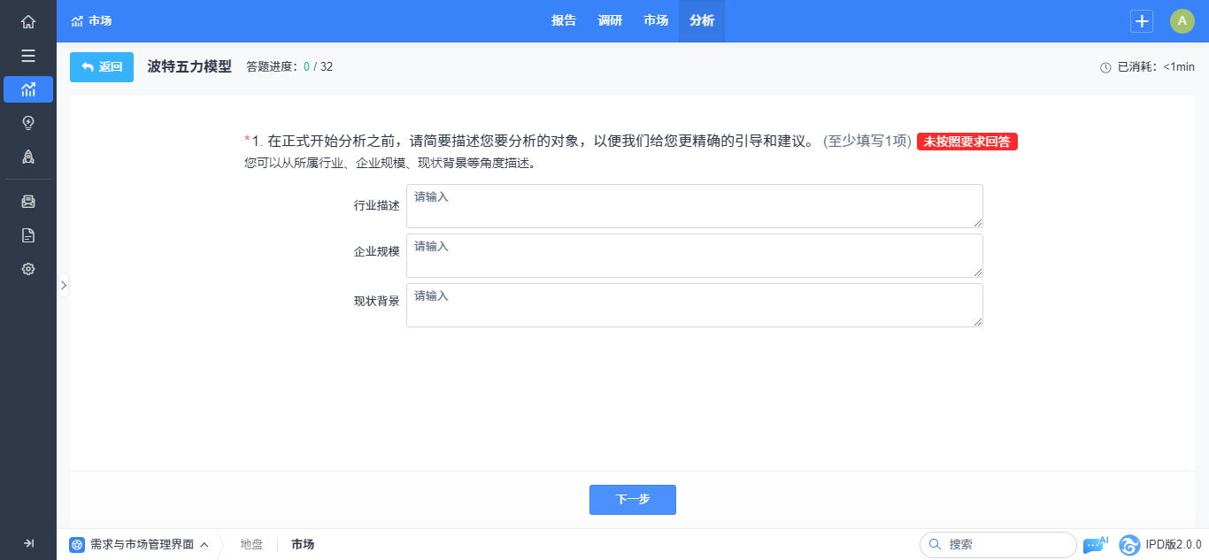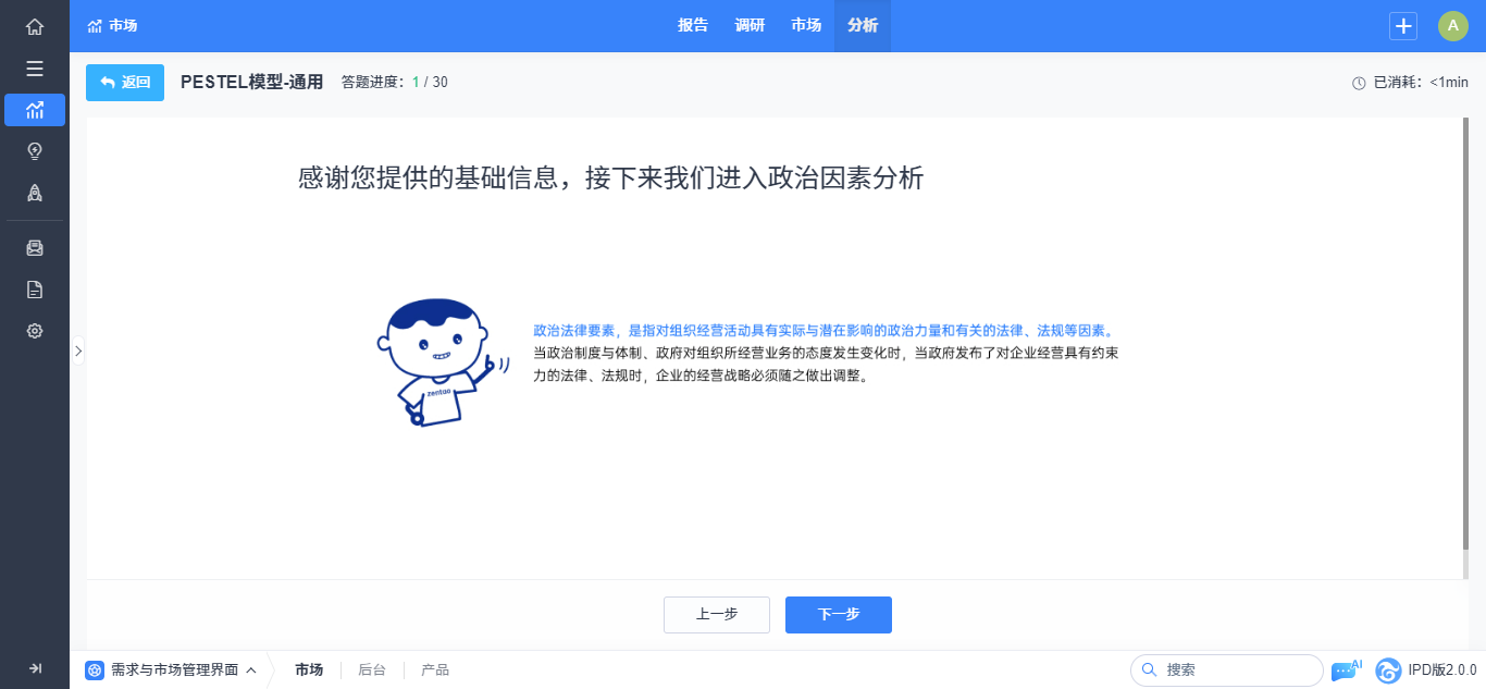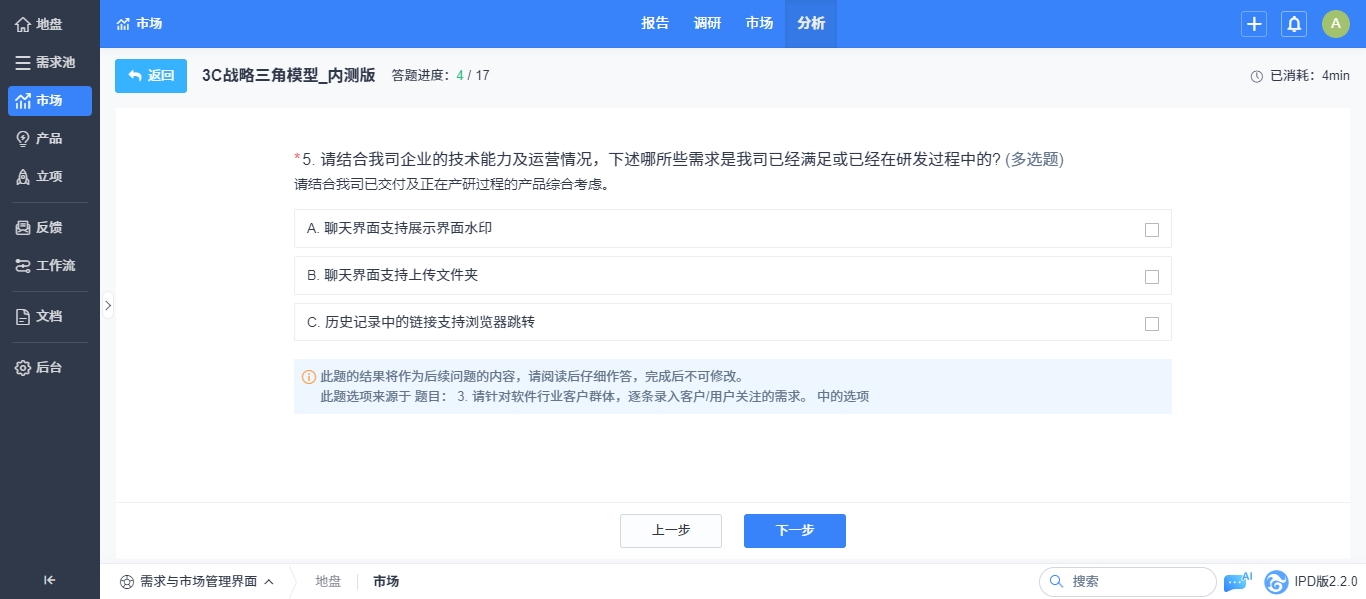 - 模型分析者点击开始后,会按照设计师配置的步骤进行答题,我们采用一页一题的展现方式,便于您更聚焦当前问题,引导您更沉浸的思考。