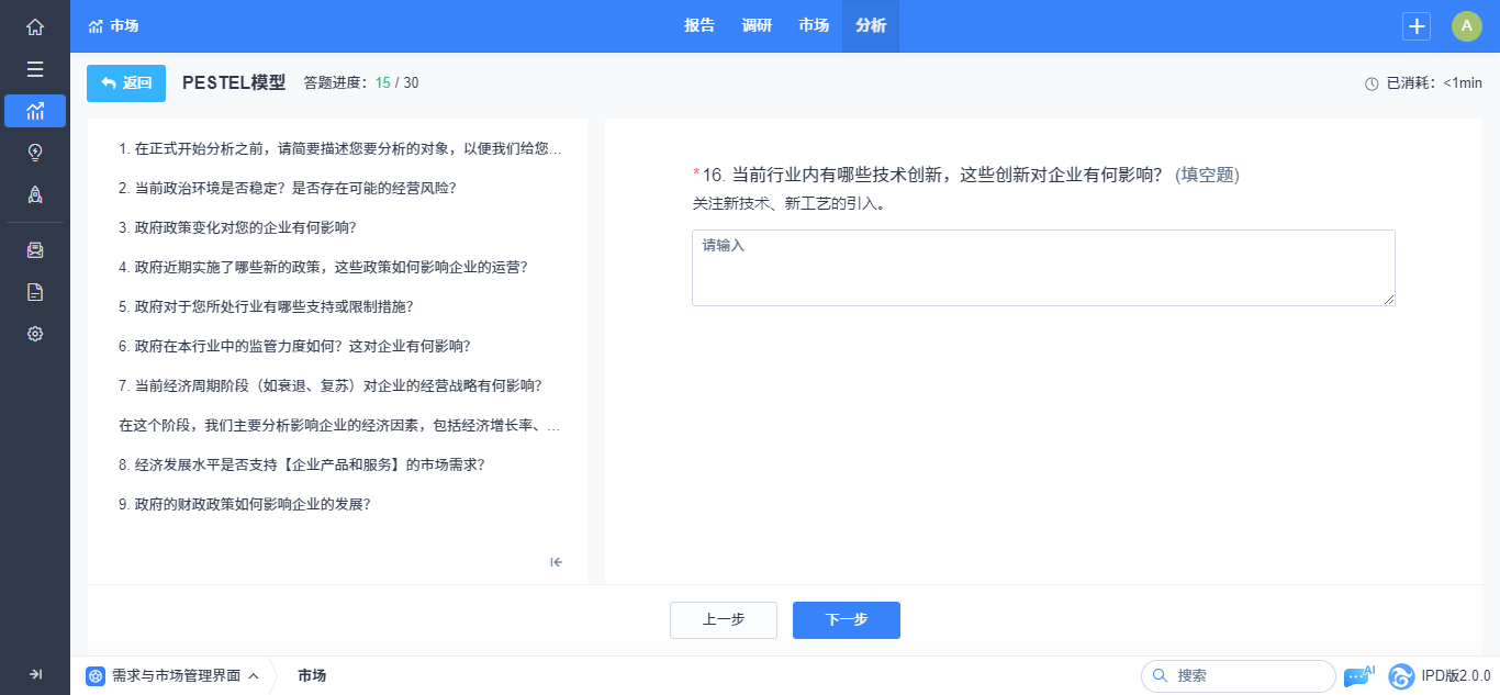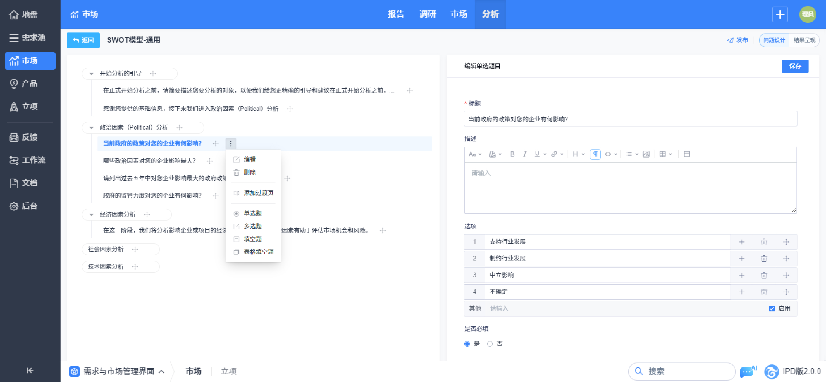 禅道推出了企业决策分析解决方案,集成了 SWOT、PESTEL、波特五力、4P营销管理、3C战略三角等分析模型,可以帮助企业全面了解自身状况和外部环境,更好地制定战略决策、规划业务发展方向,预测市场趋势和风险。我们采用问答式引导方式,将抽象的模型和方法转化为易于理解的形式,在问答过程中能够理解模型逻辑,并形成结构化的结果展示。此外,我们提供对模型设计的能力, 设计者将他们的想法转化为可操作的引导流程,使用问答的方式传递模型逻辑,以便于想法更容易理解、实施和传达。