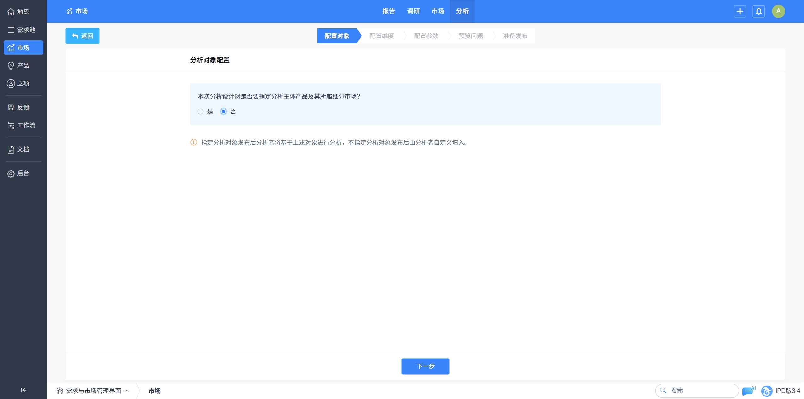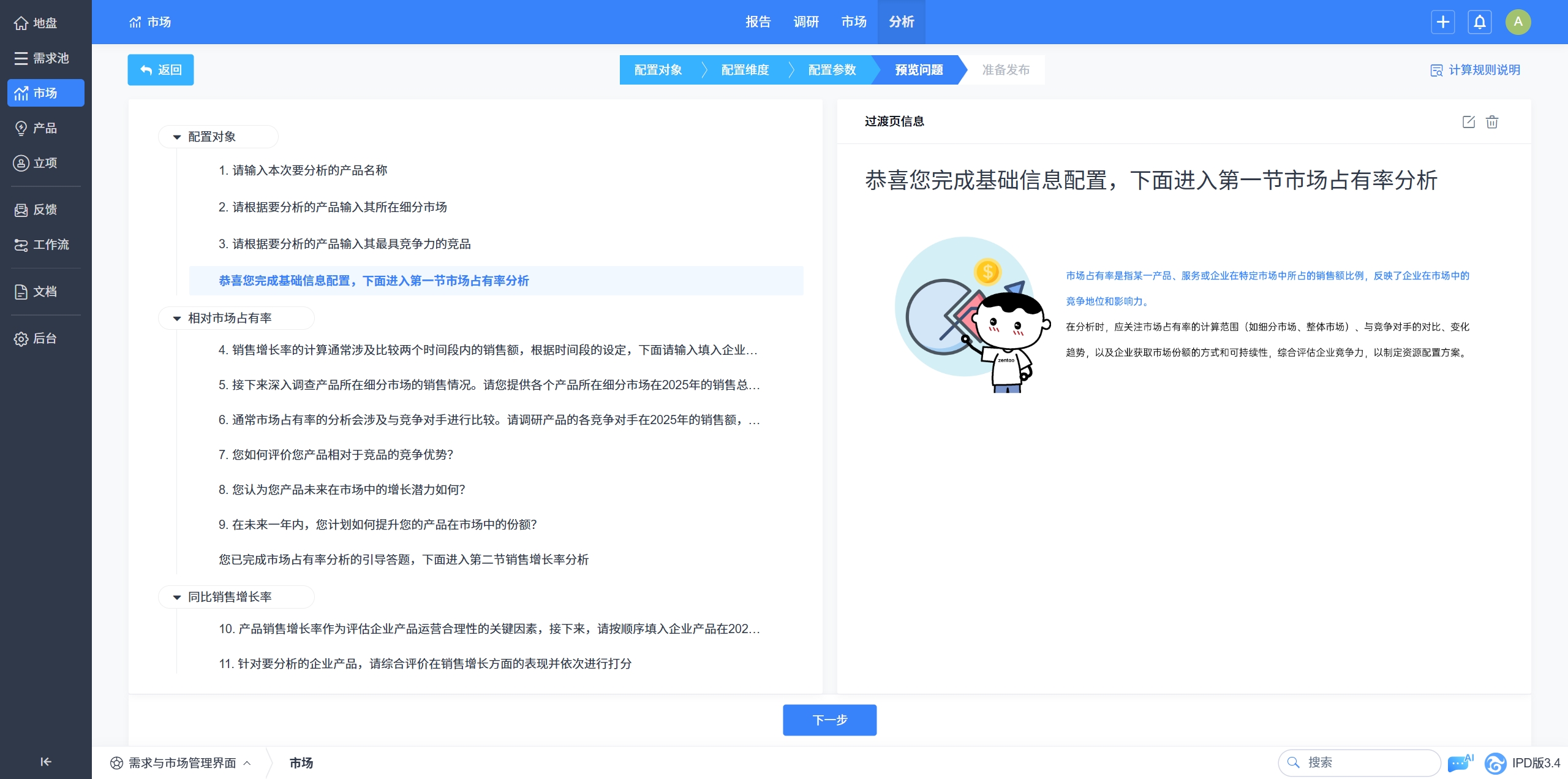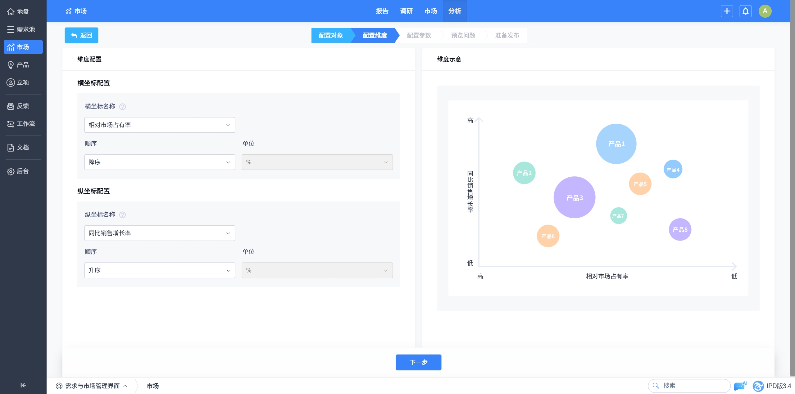 注意请输入企业运营的多个不同的产品,在进行细分市场和竞品定义时也需要尽可能细致、独立且不重复,以便于避免数据重叠,更精准地评估各产品的市场表现和战略定位,设置完成后点击下一步按钮将进入配置维度页面。