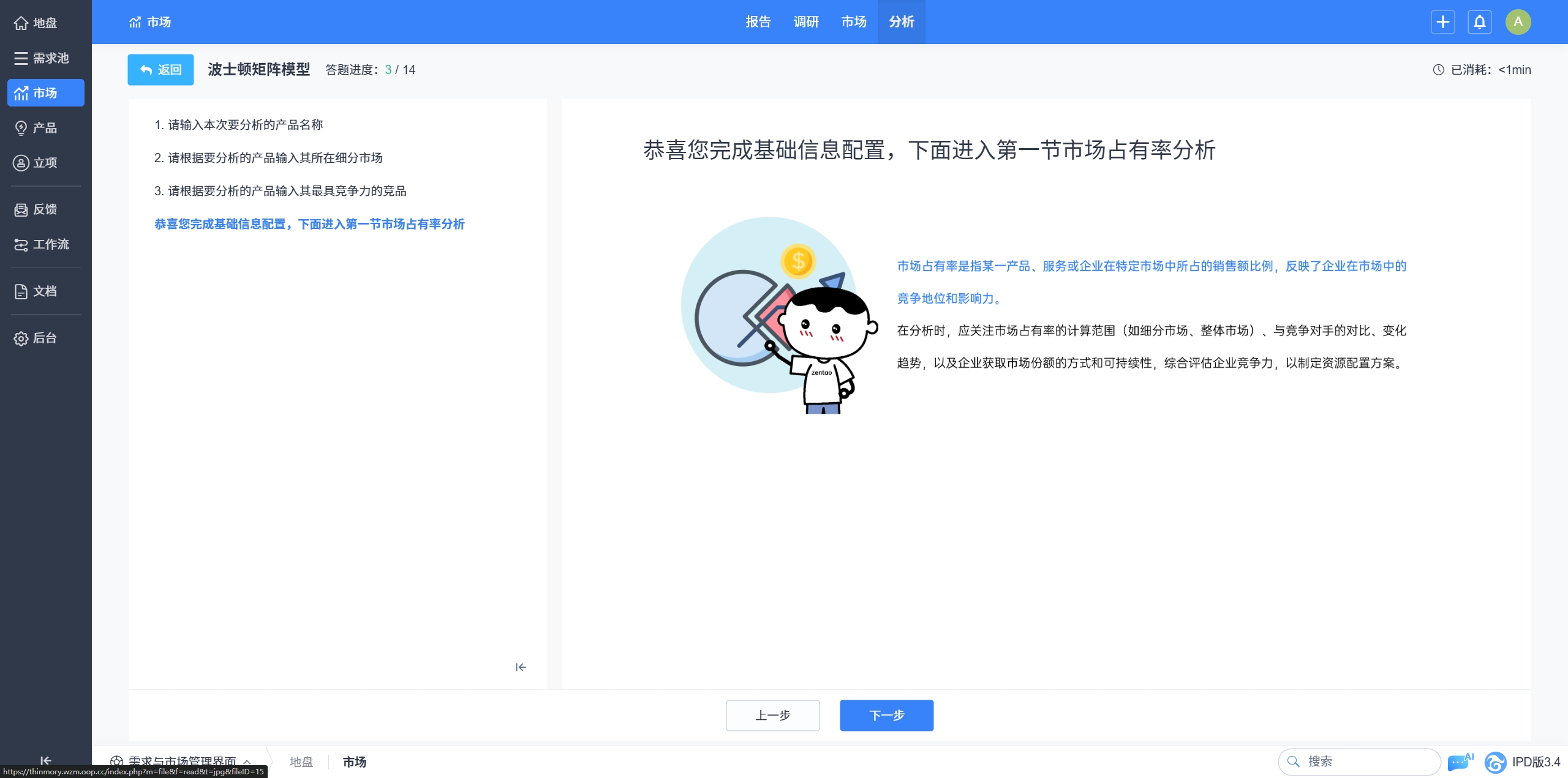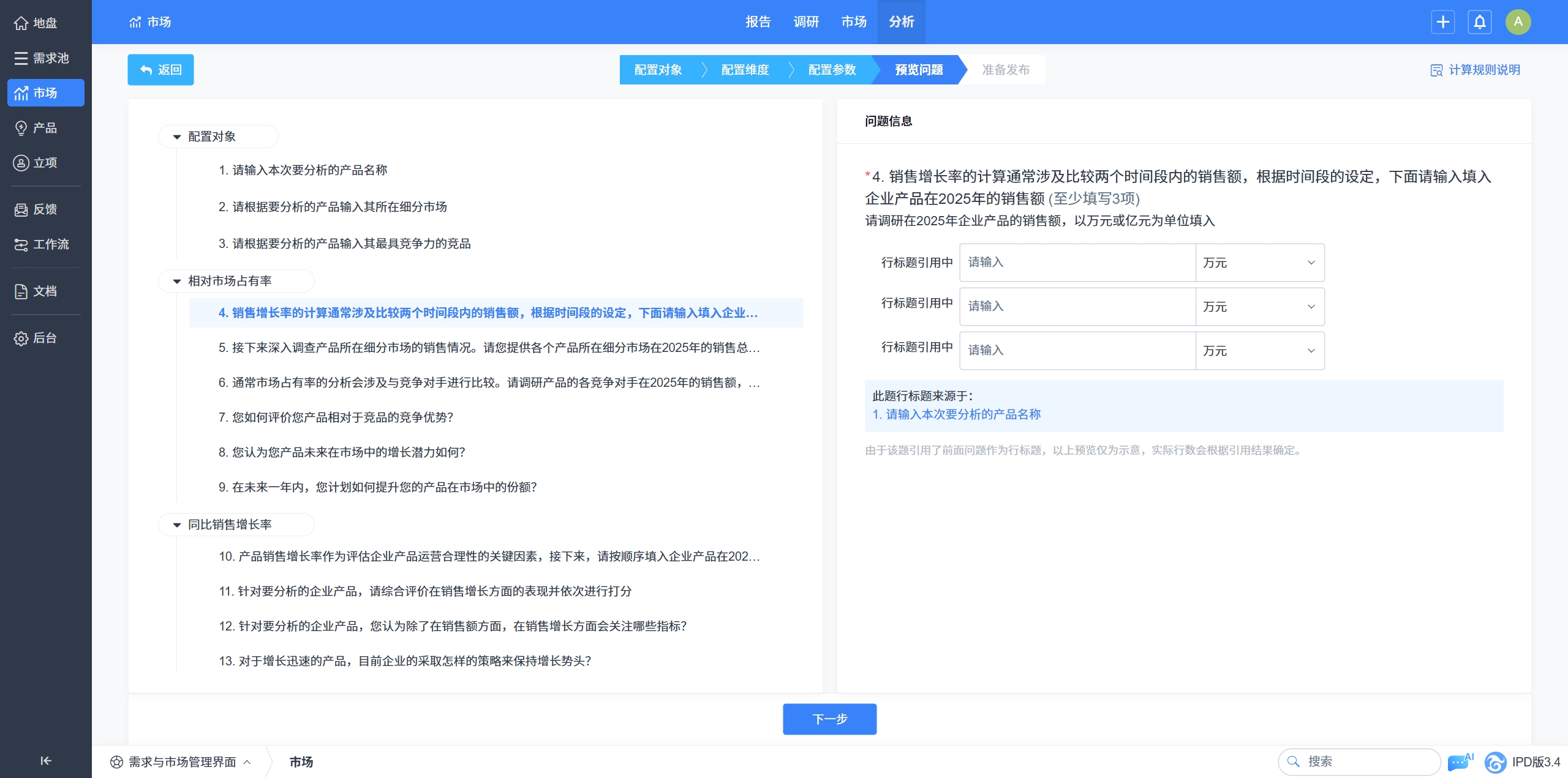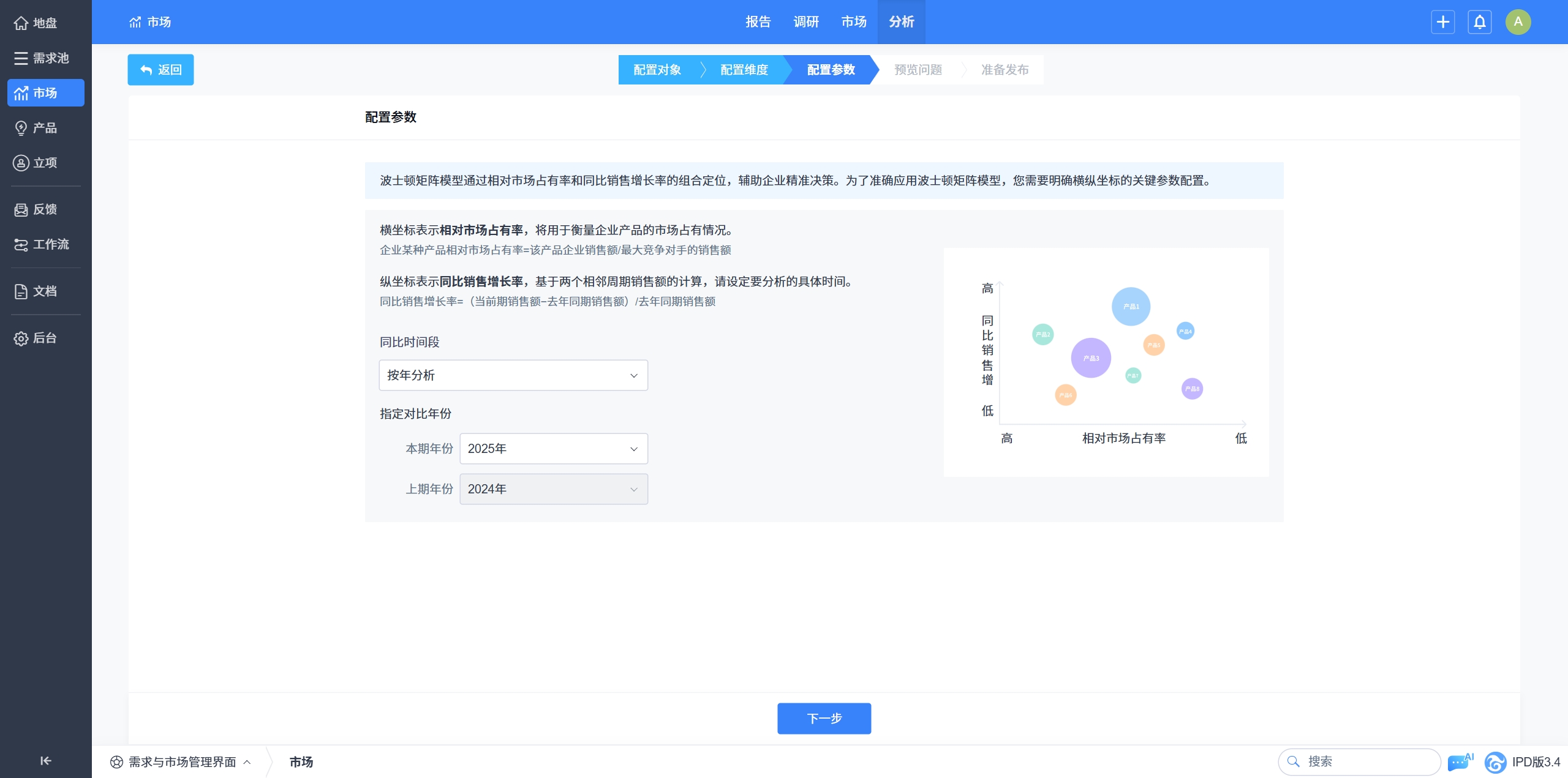 注意请输入企业运营的多个不同的产品,在进行细分市场和竞品定义时也需要尽可能细致、独立且不重复,以便于避免数据重叠,更精准地评估各产品的市场表现和战略定位,设置完成后点击下一步按钮将进入配置维度页面。