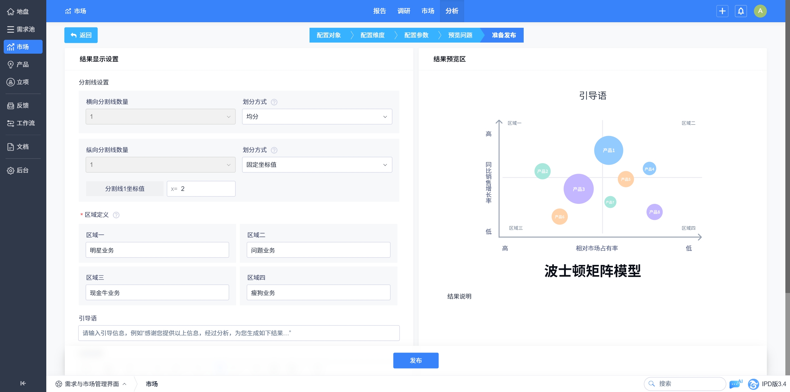 波士顿矩阵模型横纵坐标轴分别从市场份额和销售增长率两个维度帮助企业进行竞品分析,配置维度页面支持模型设计师设置横纵维度具体的计算方式。