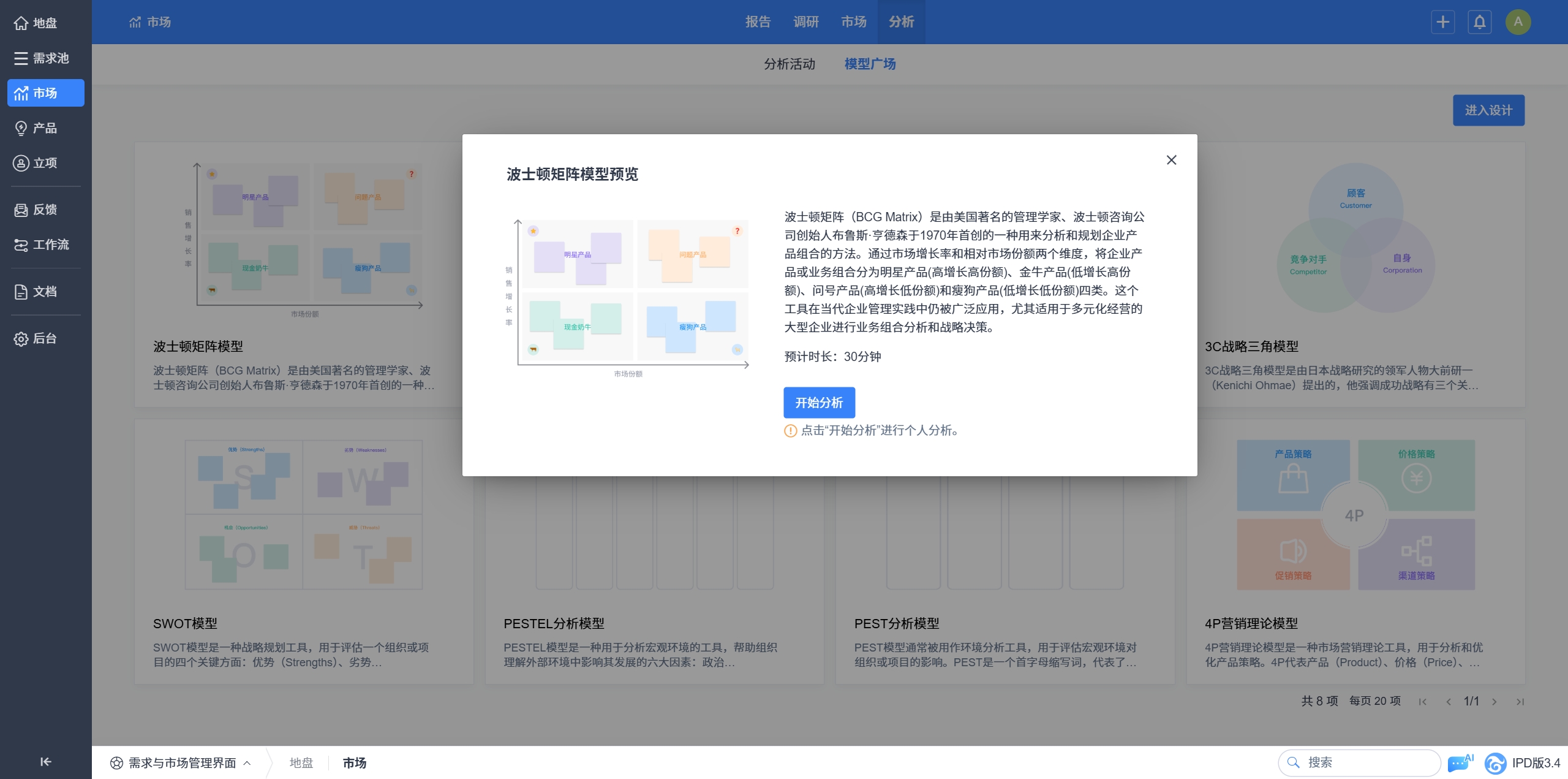 在模型广场中选择模型,点击【开始分析】即可根据问题引导进行分析。
