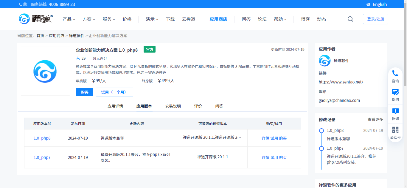 1. 应用商店中的应用仅用于开源版禅道,支持自行申请试用和购买,请详见应用商店页面。