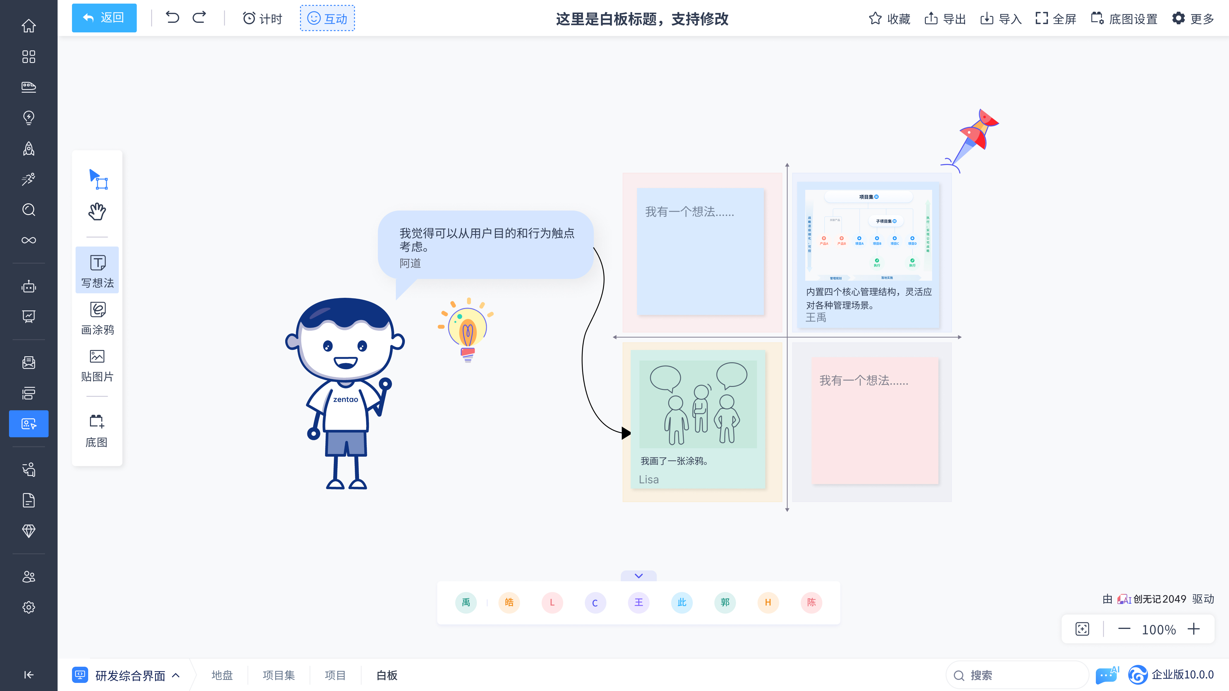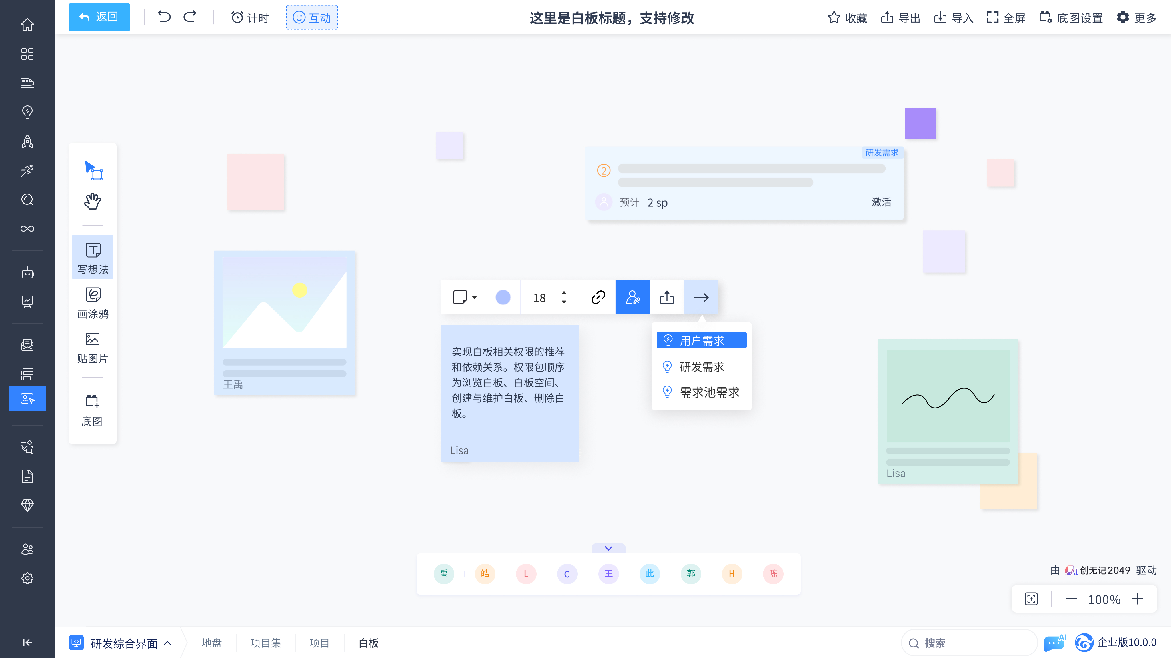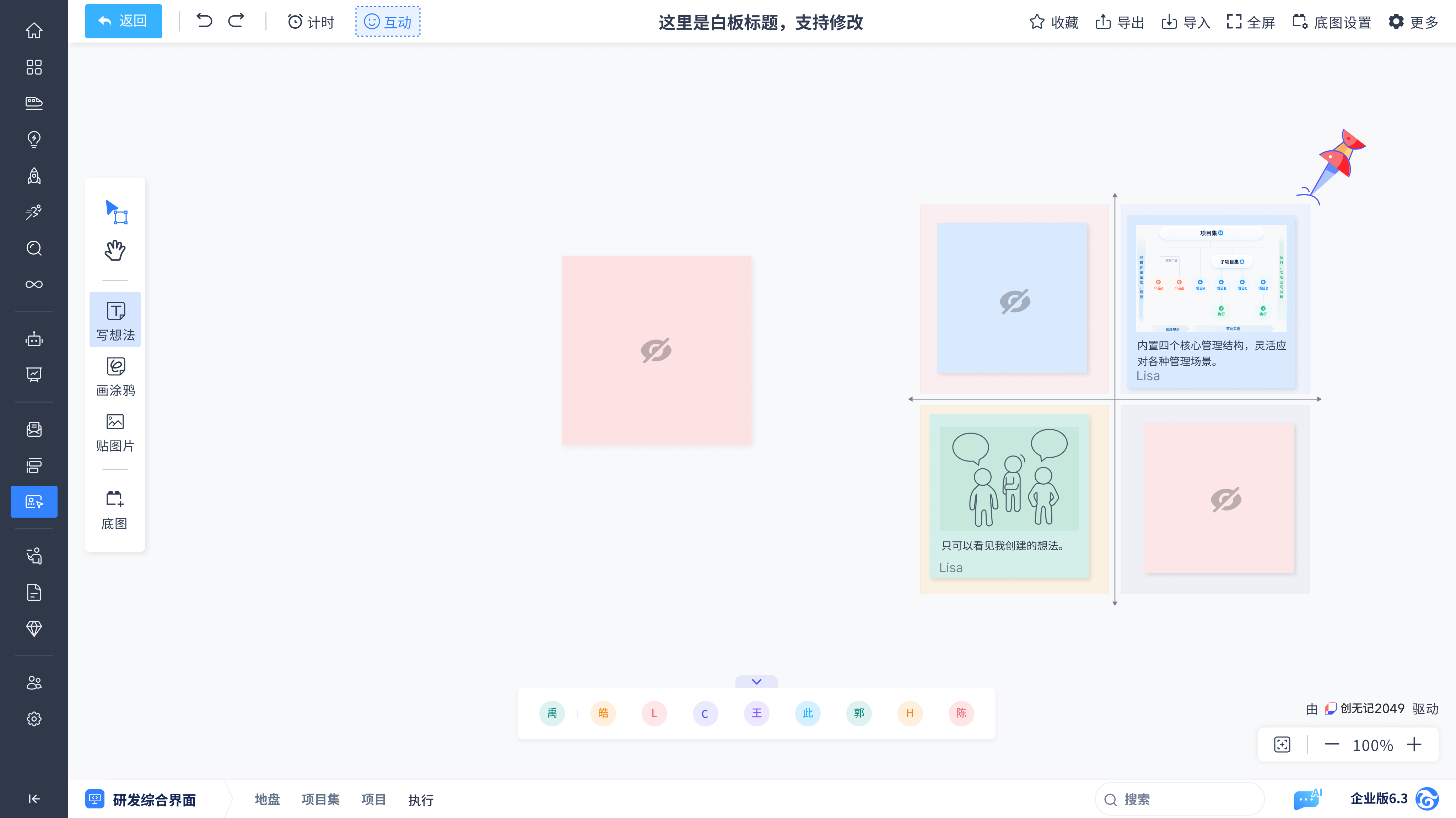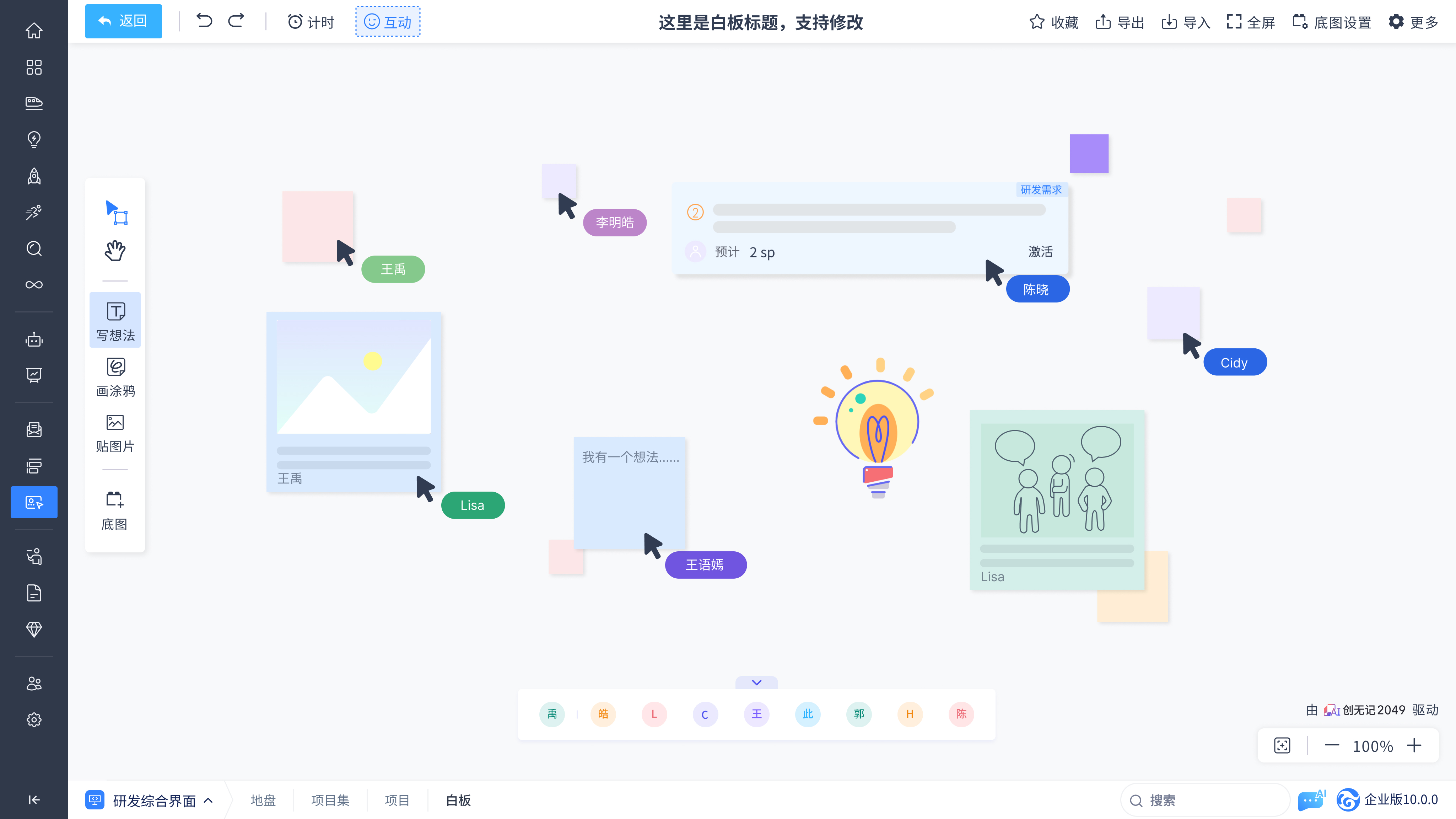 提供如便签、涂鸦、图片、连线、贴纸、底图等多种工具,团队可以自由绘制和添加各种元素,灵活表达创意和构建内容。