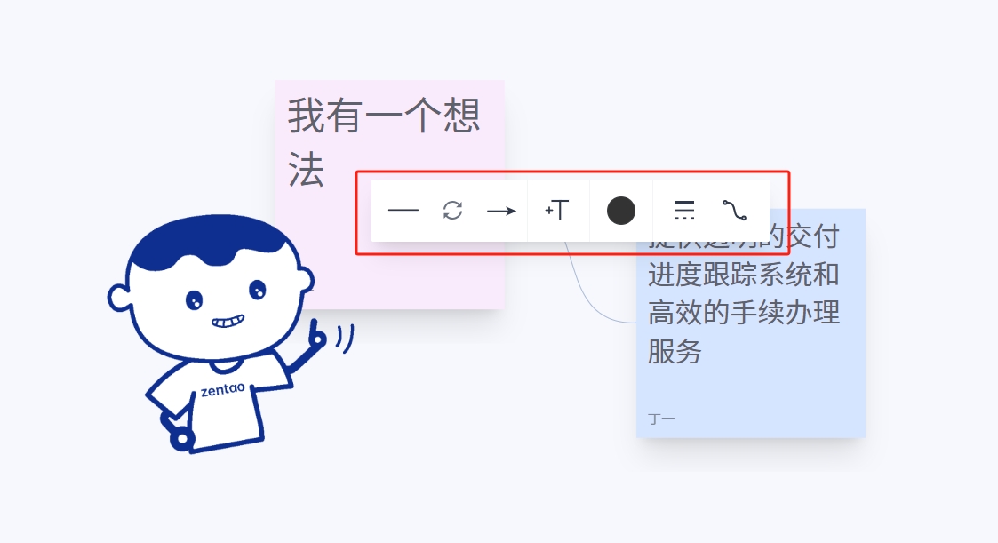 在多个元素之间绘制连线,展示便签间的关系。选中单一便签或单一组,点击元素外围的控制点并拖动光图标或拉至其他元素上将为两个元素建立连线。