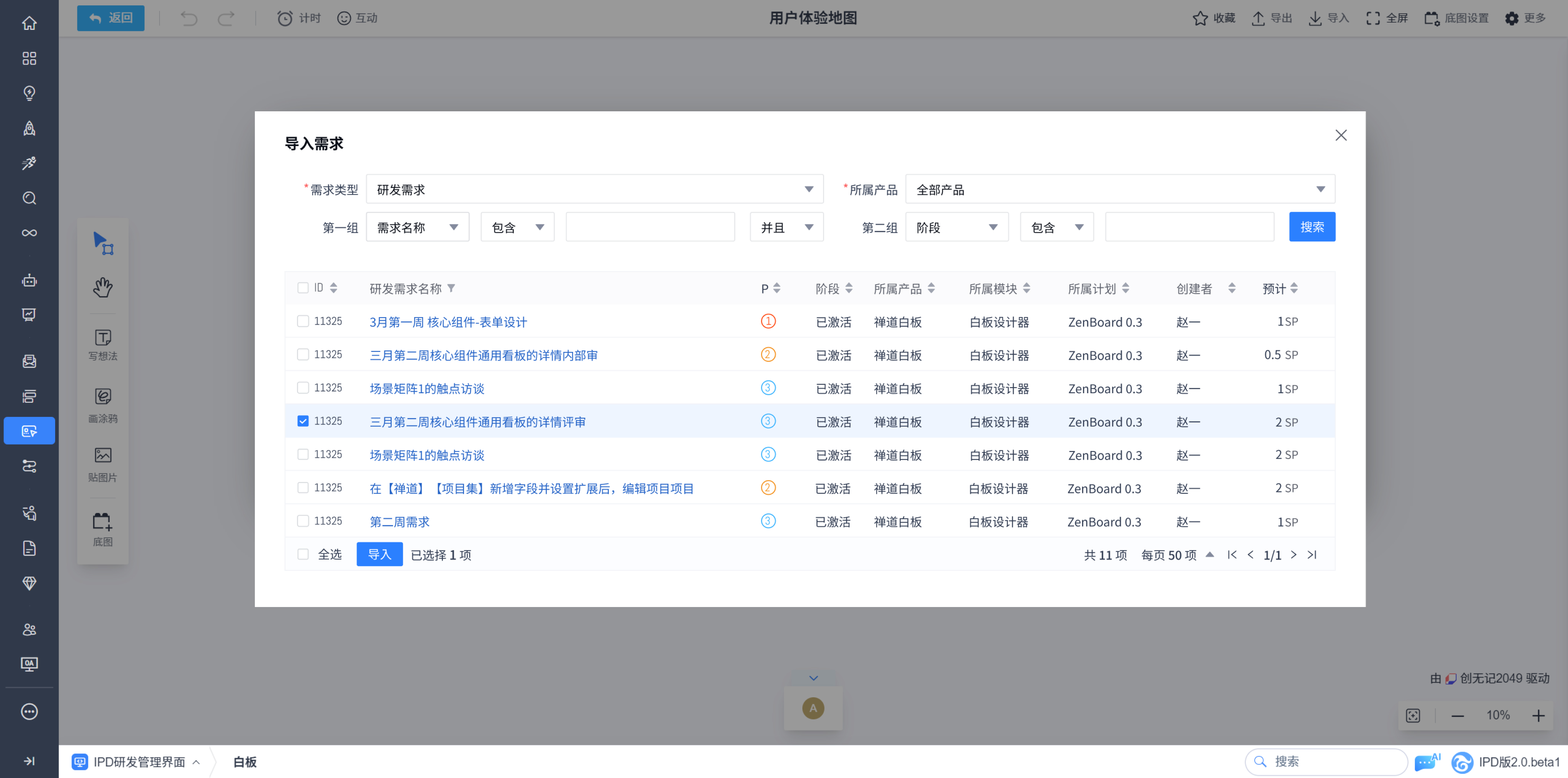 根据所在的不同界面支持一键导入禅道需求,将对应对象快速转换为白板卡片,方便进行需求管理和协作。