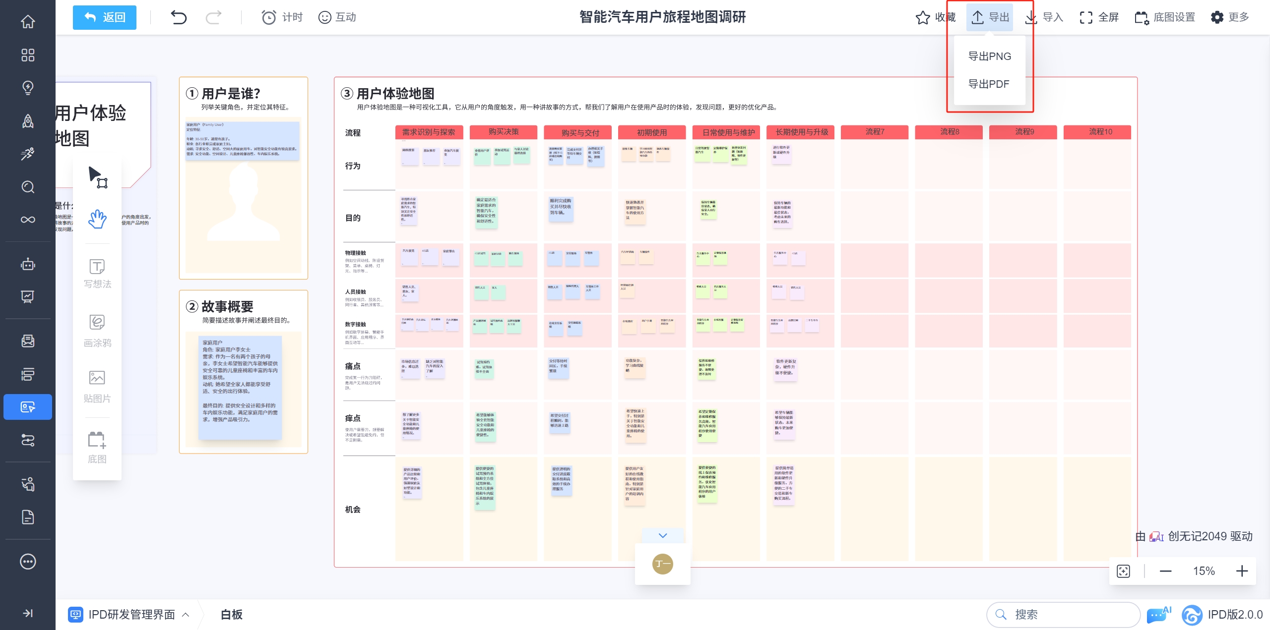 支持一键导出画布,提供PNG和PDF格式,方便分享和保存您的创作成果。点击顶部操作栏中的导出按钮,选择导出格式PNG/PDF将画布内容导出至本地。