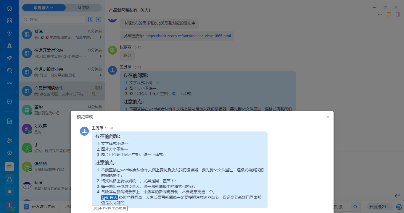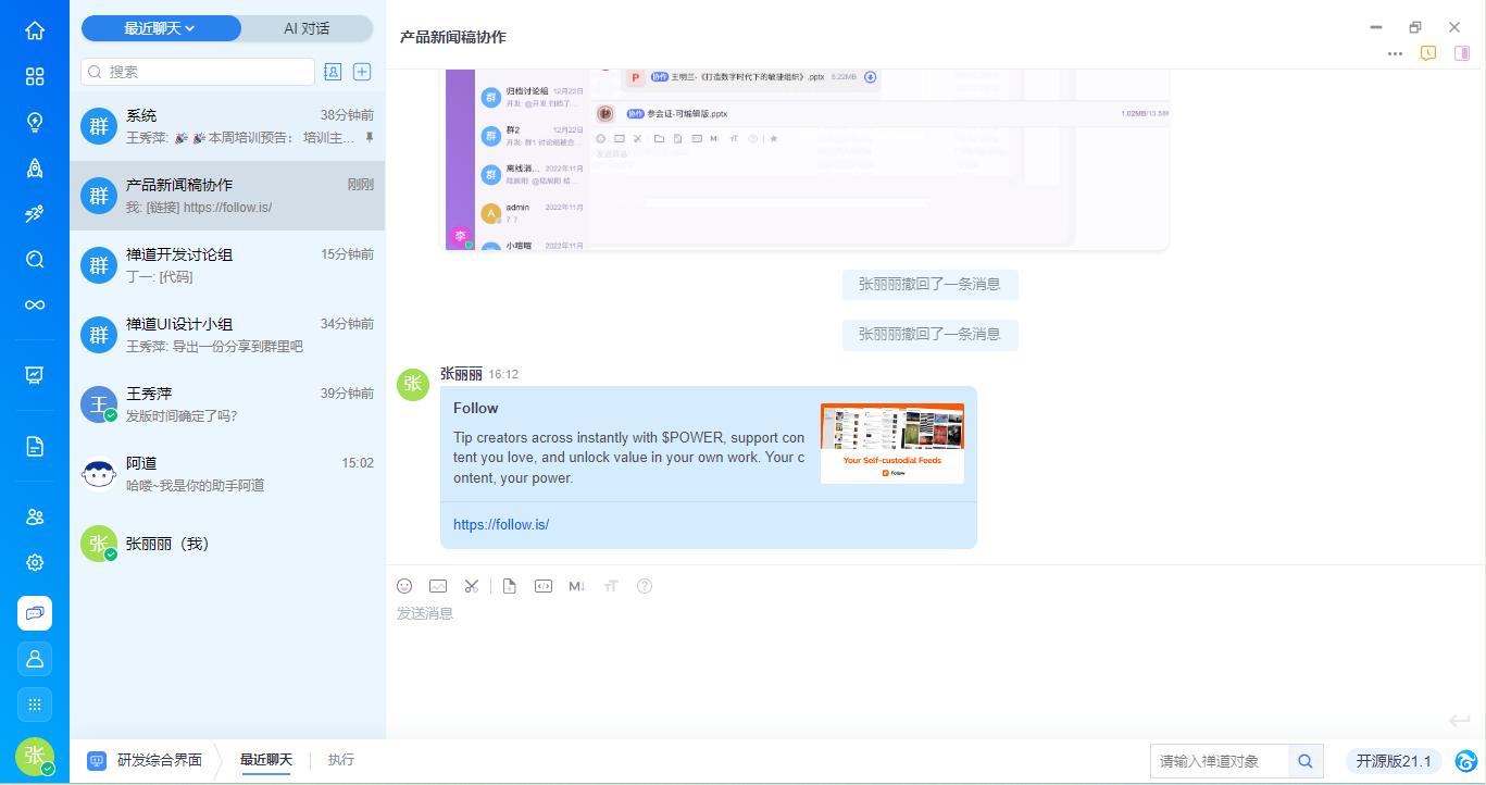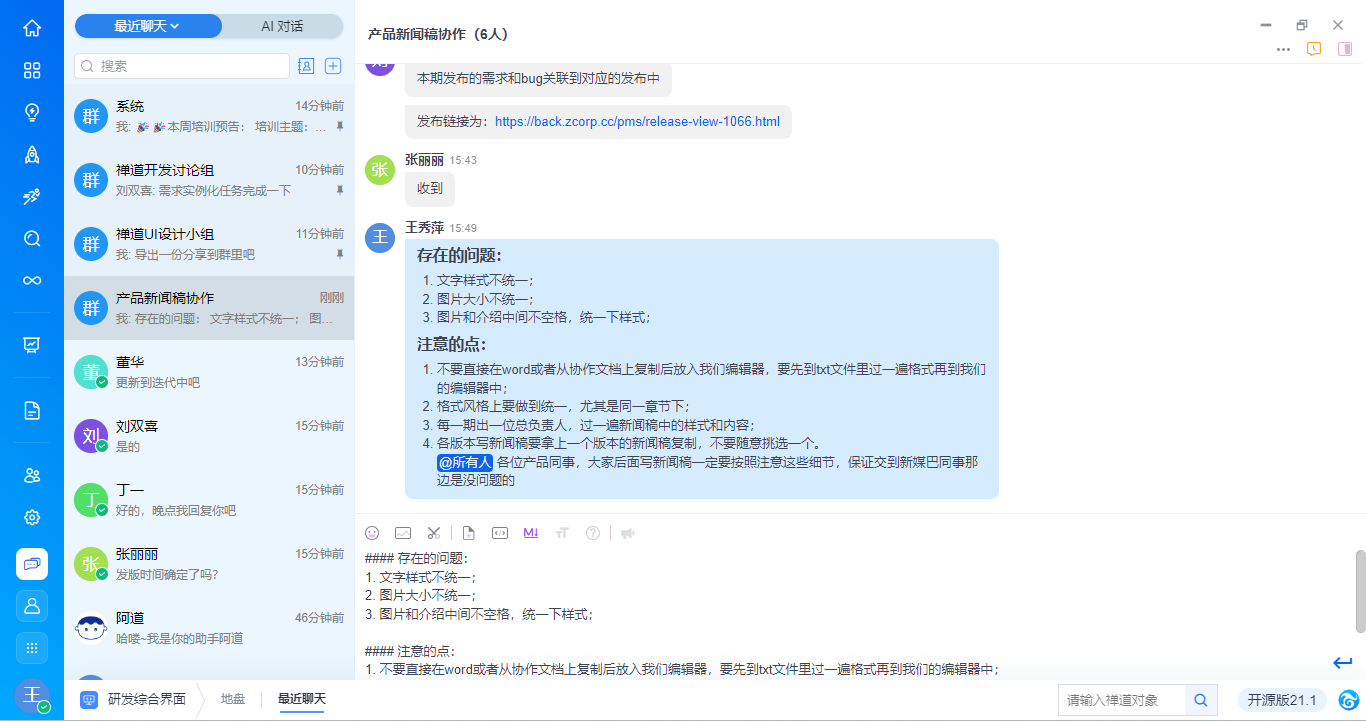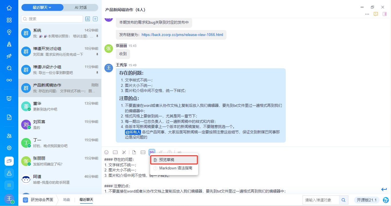 - 提供自研截图工具ZenShot,便于聊天时快速截图并发送。