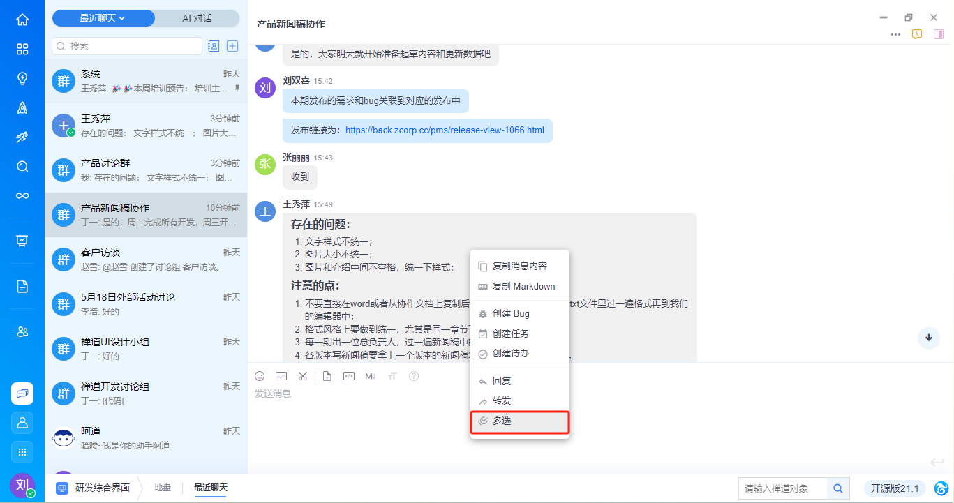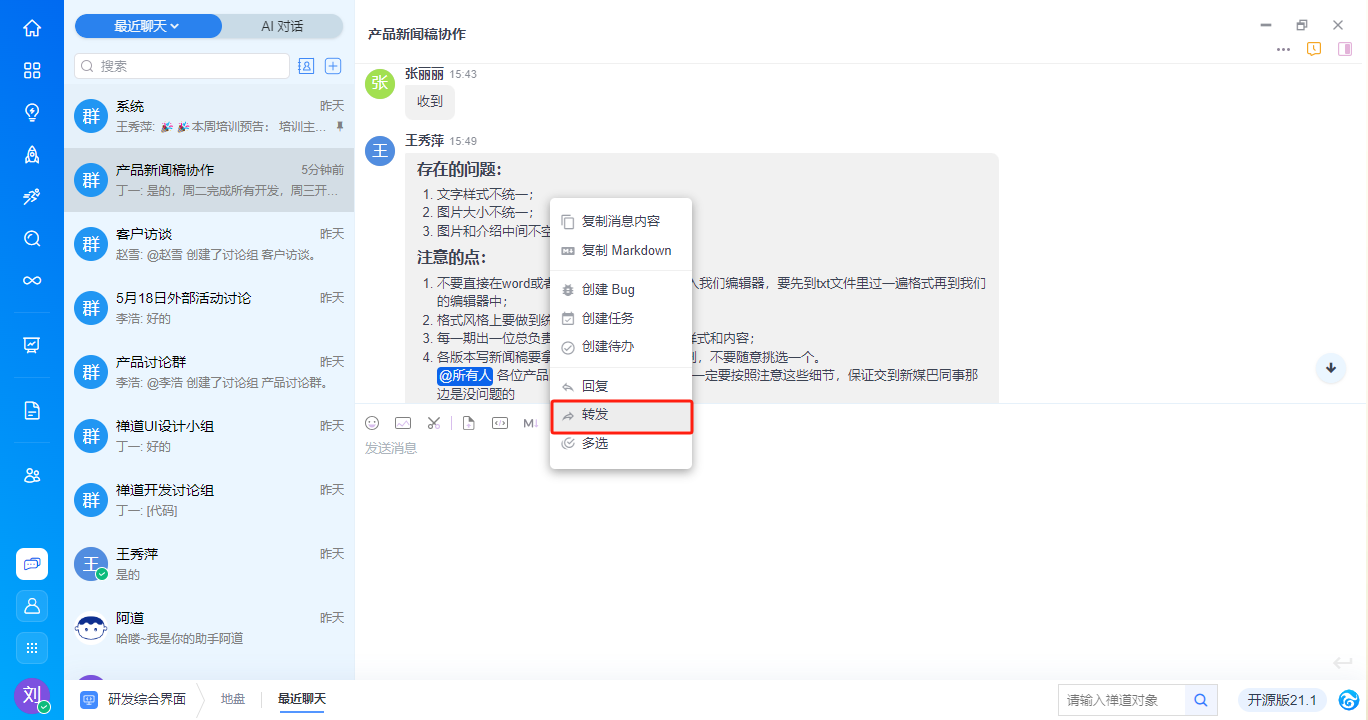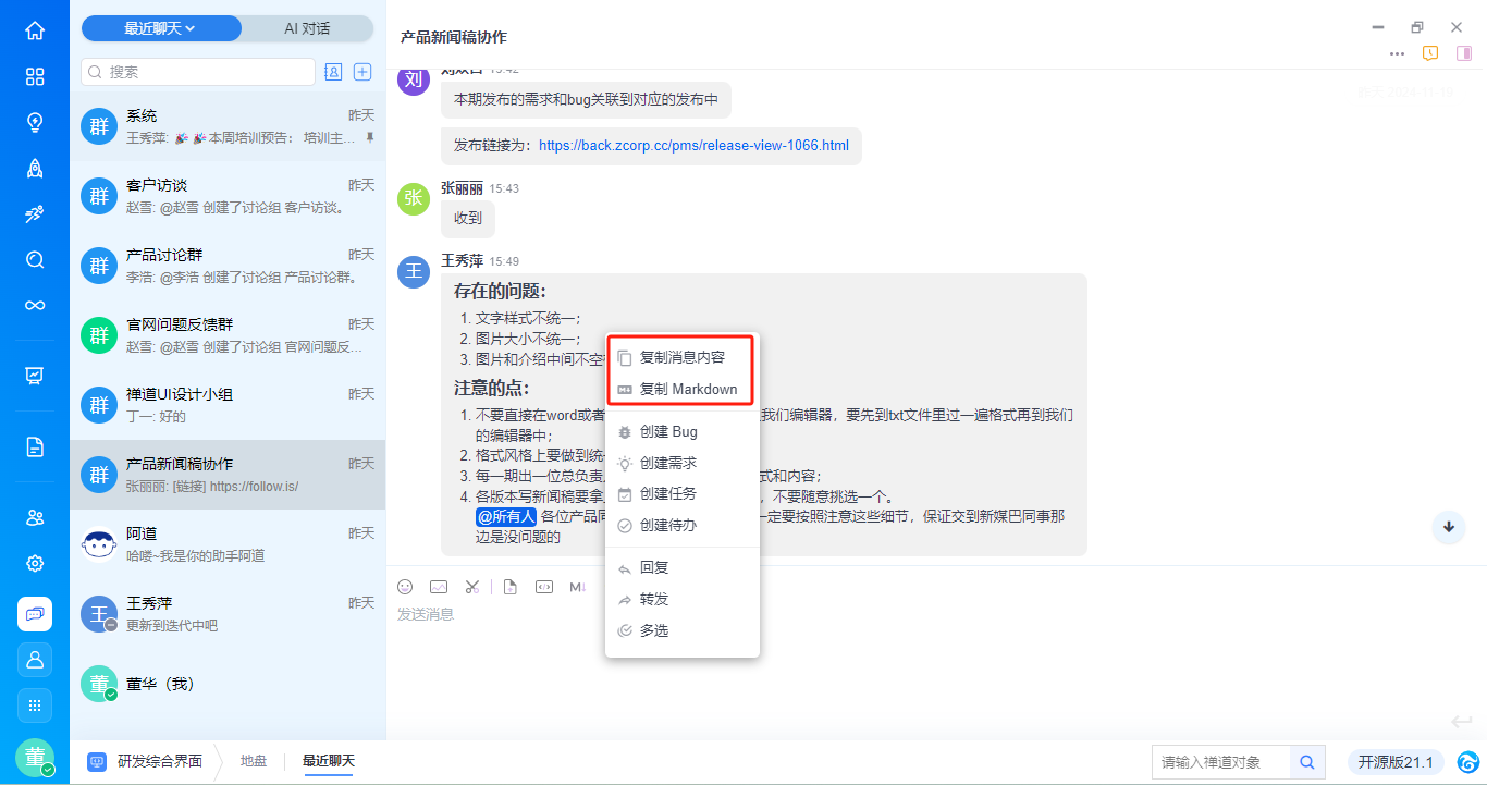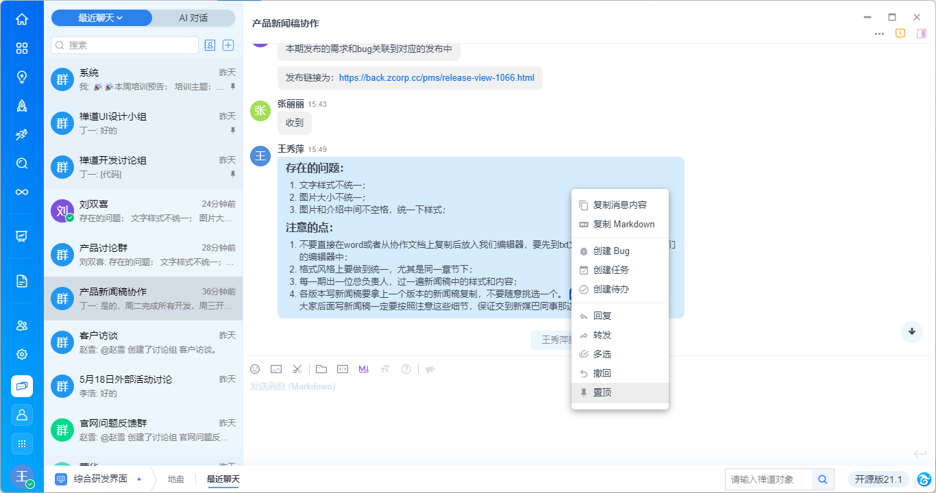 - 支持基于消息内容右键新建需求、任务、bug、待办,与禅道进行高效协同,具体功能请见手册《基于对话消息创建禅道对象》。