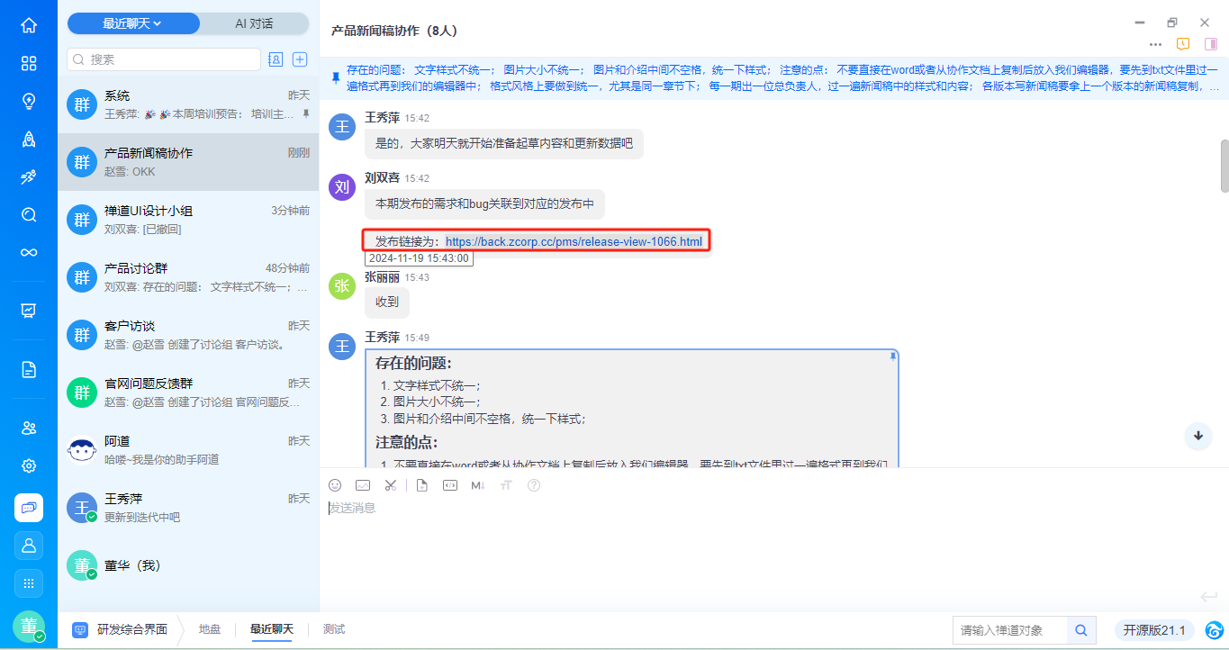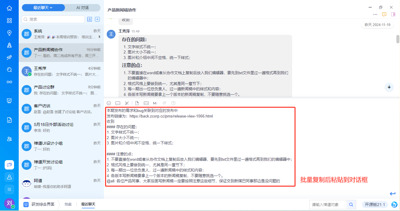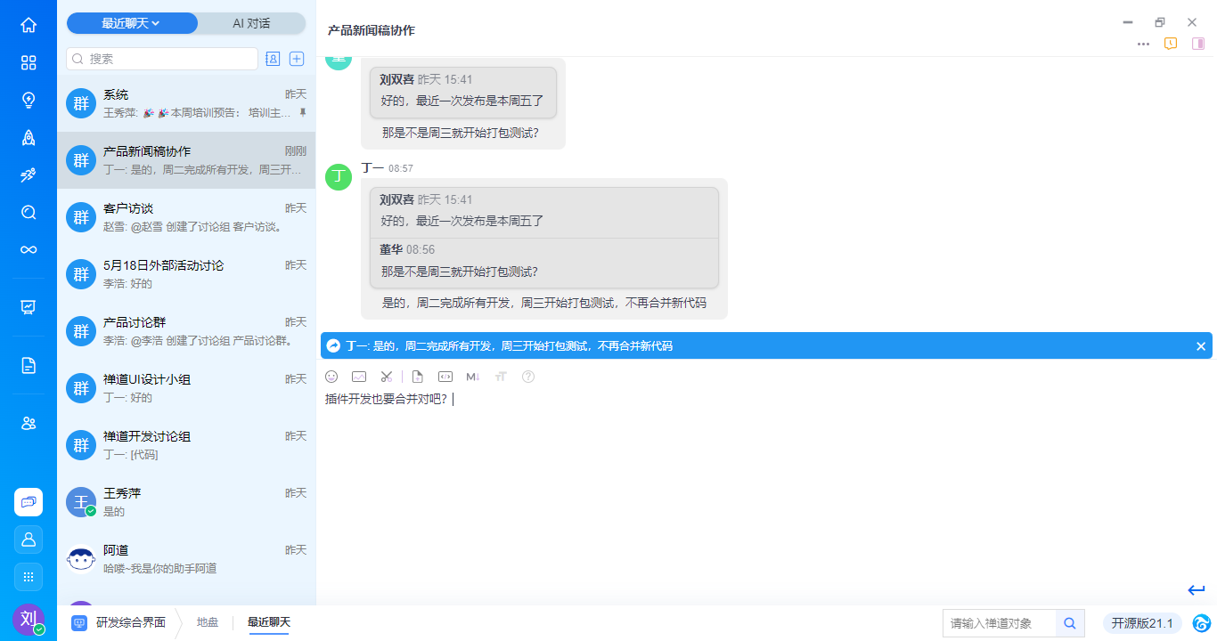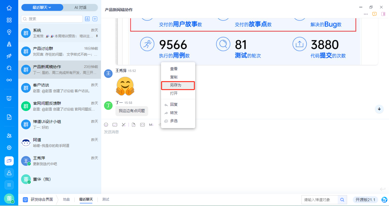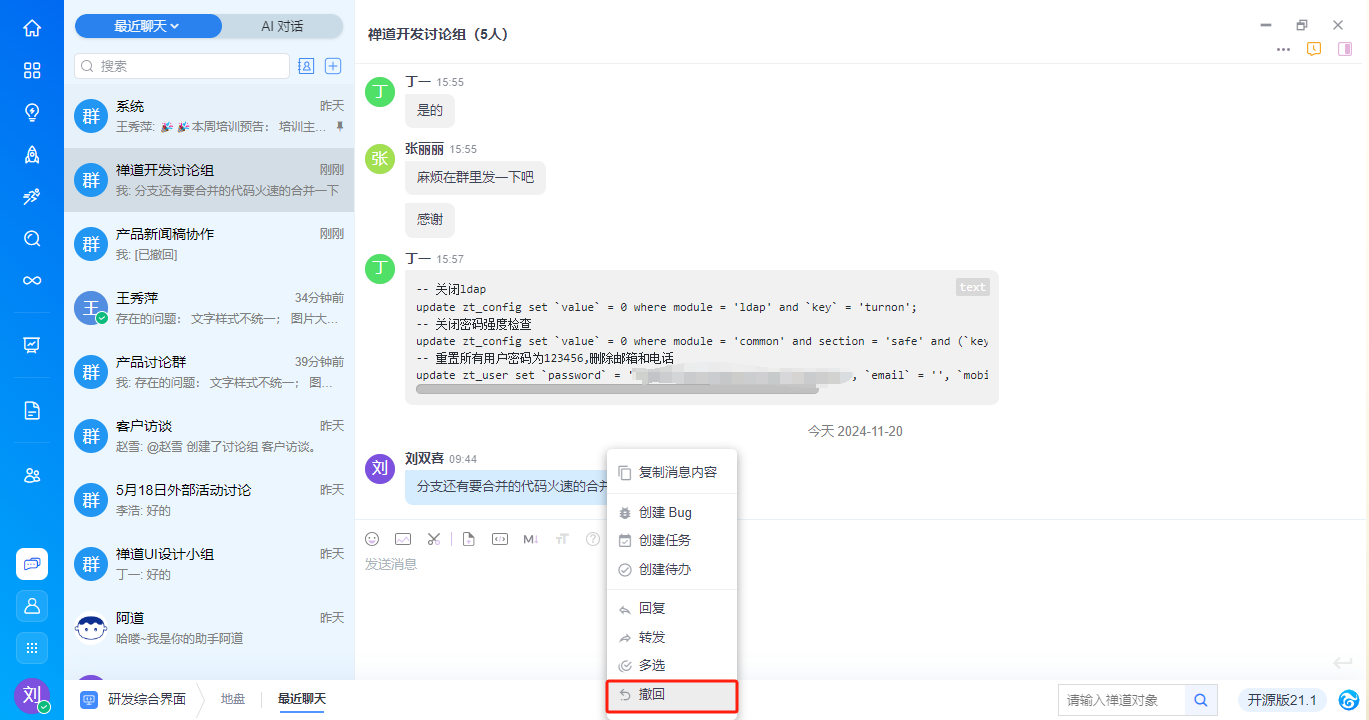 - 支持基于消息内容右键新建需求、任务、bug、待办,与禅道进行高效协同,具体功能请见手册《基于对话消息创建禅道对象》。